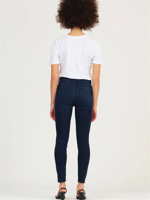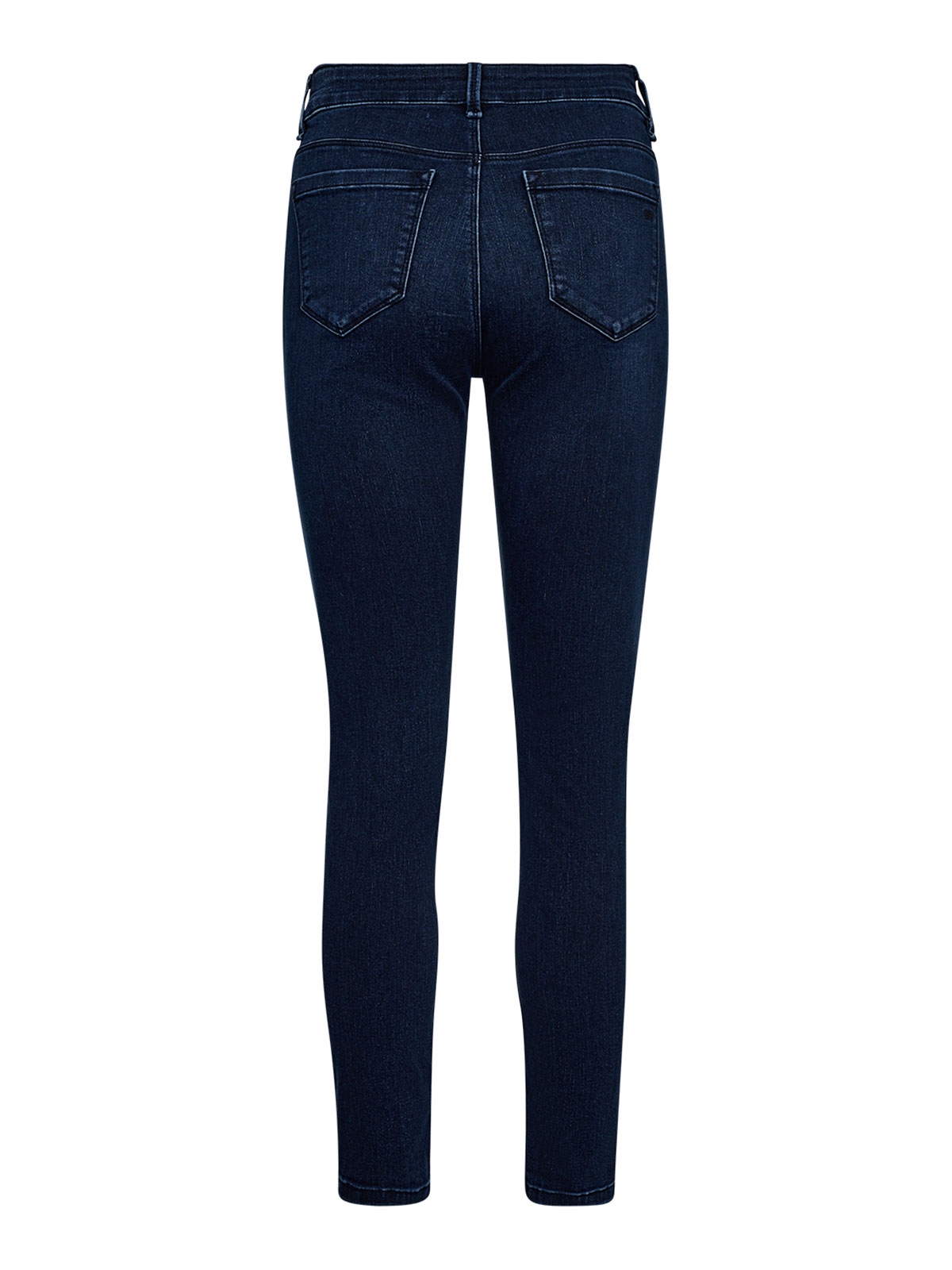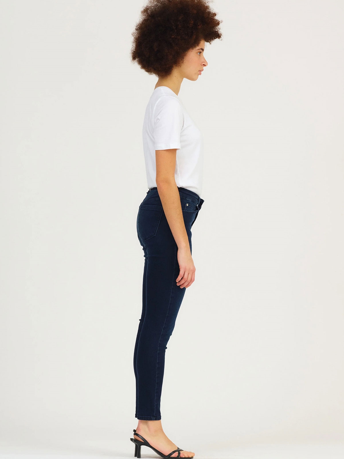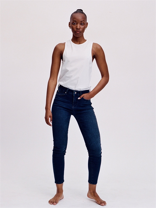 Jeans fra IVY Copenhagen. Jeansene har middelhøj talje og ankel længde. De har stretch og lukkes med lynlås og knap. Bukserne har lommer foran og bagpå. Tætsiddende pasform. Rå kant ved anklerne.