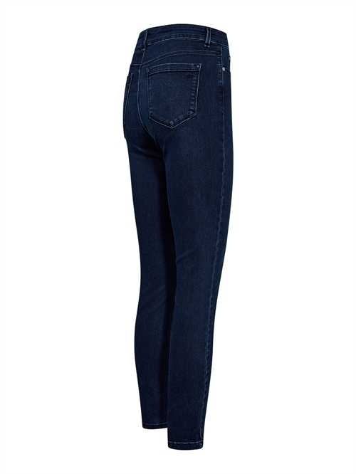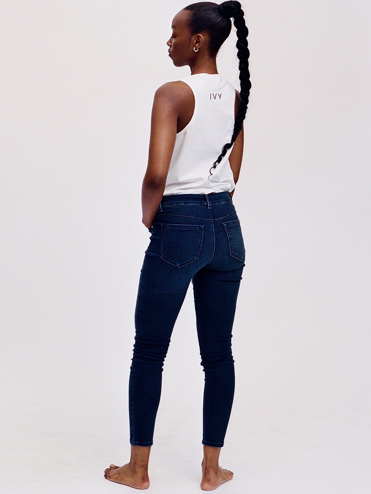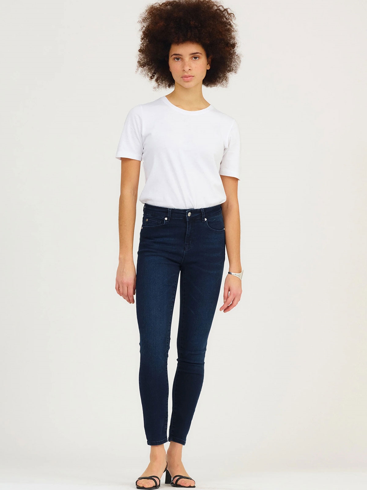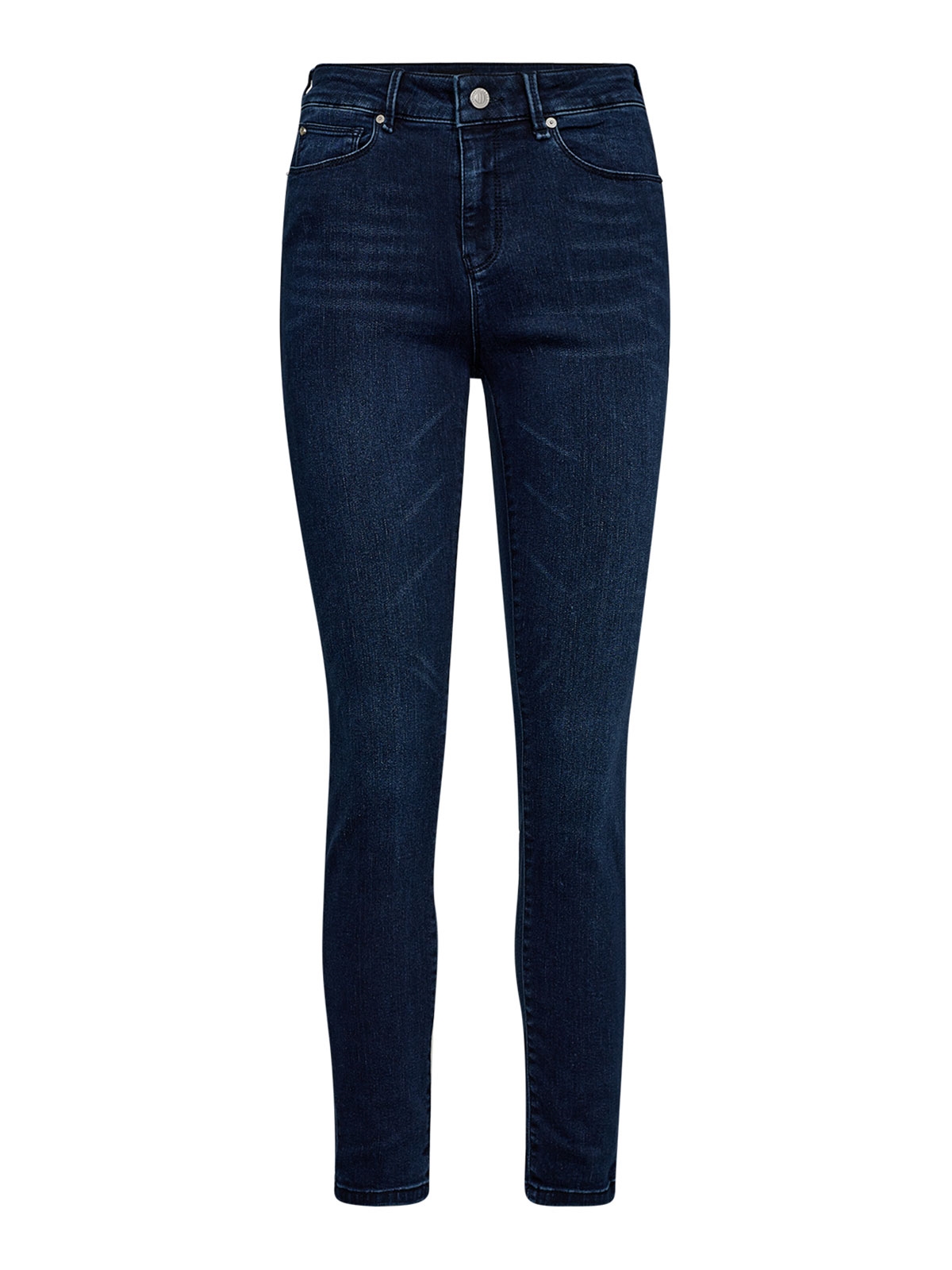 Jeans fra IVY Copenhagen. Jeansene har middelhøj talje og ankel længde. De har stretch og lukkes med lynlås og knap. Bukserne har lommer foran og bagpå. Tætsiddende pasform. Rå kant ved anklerne.
