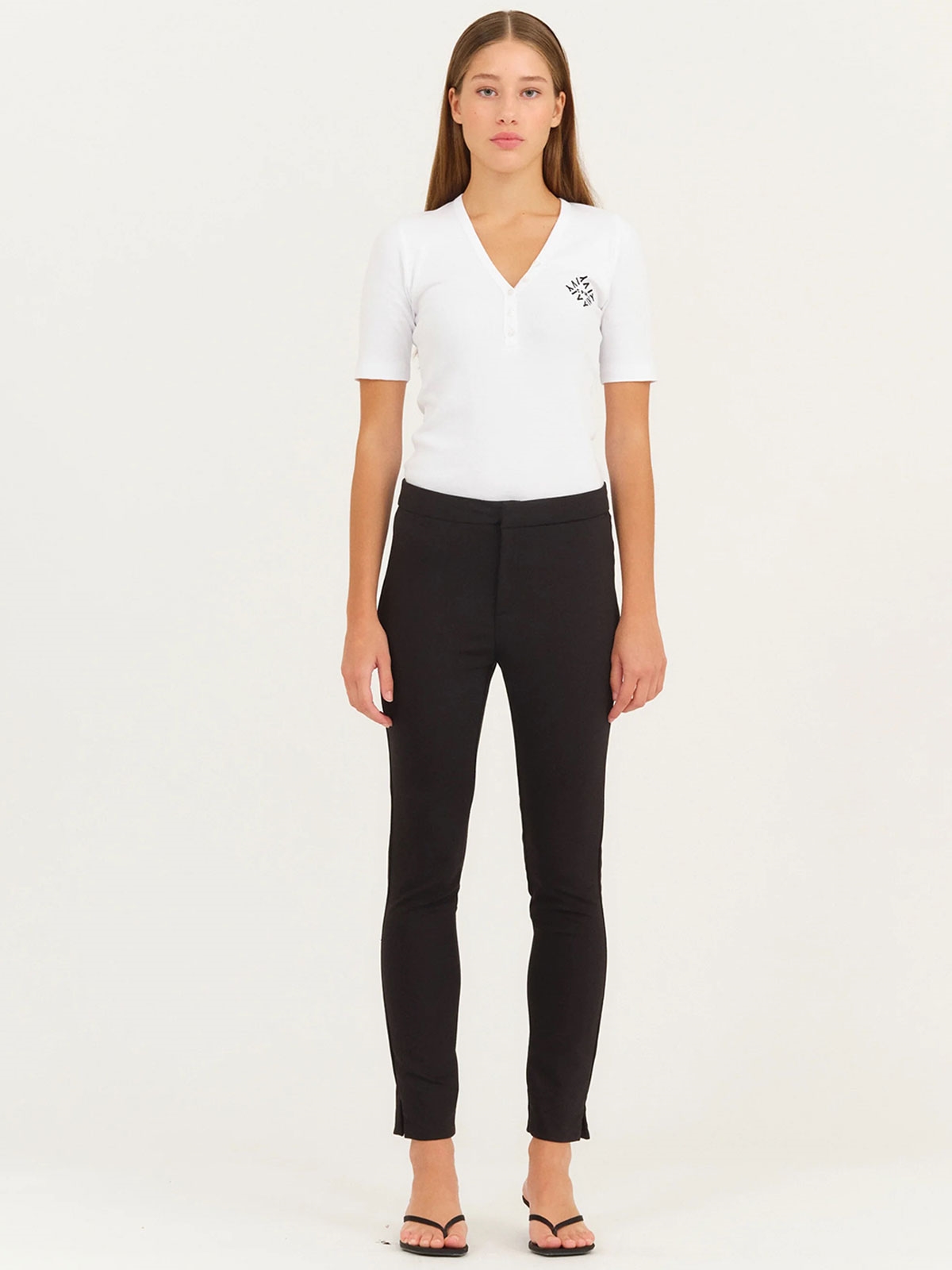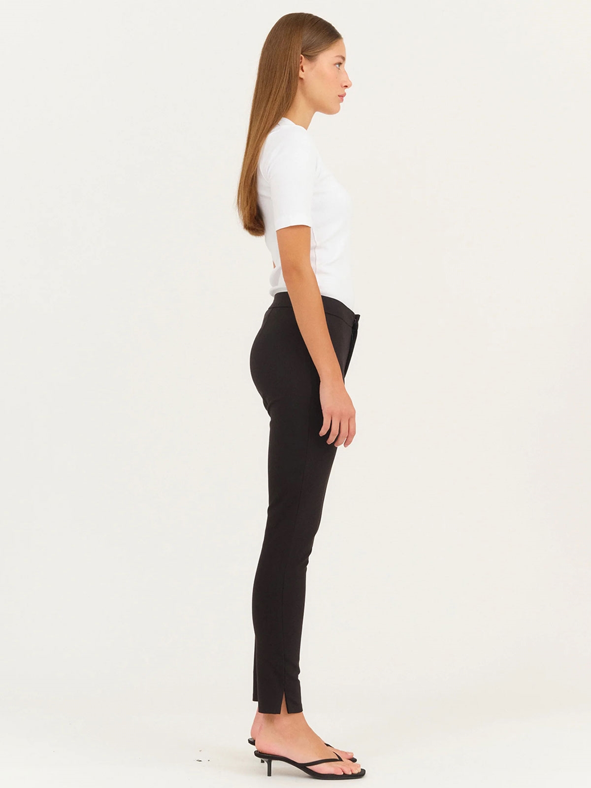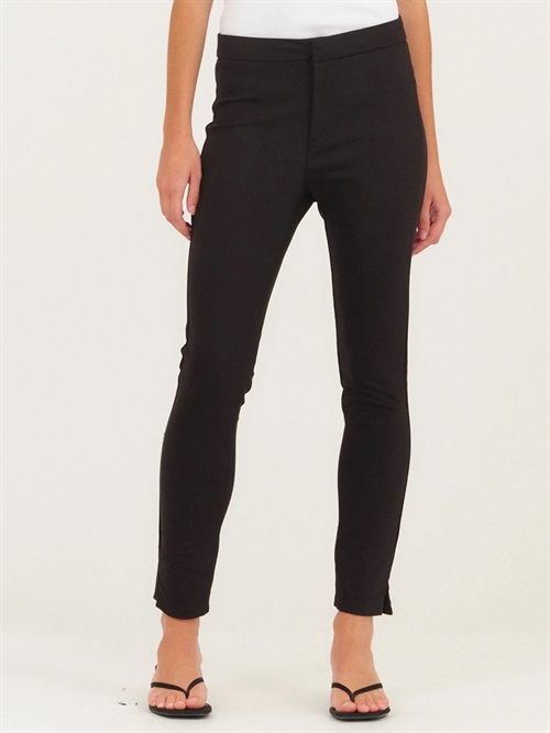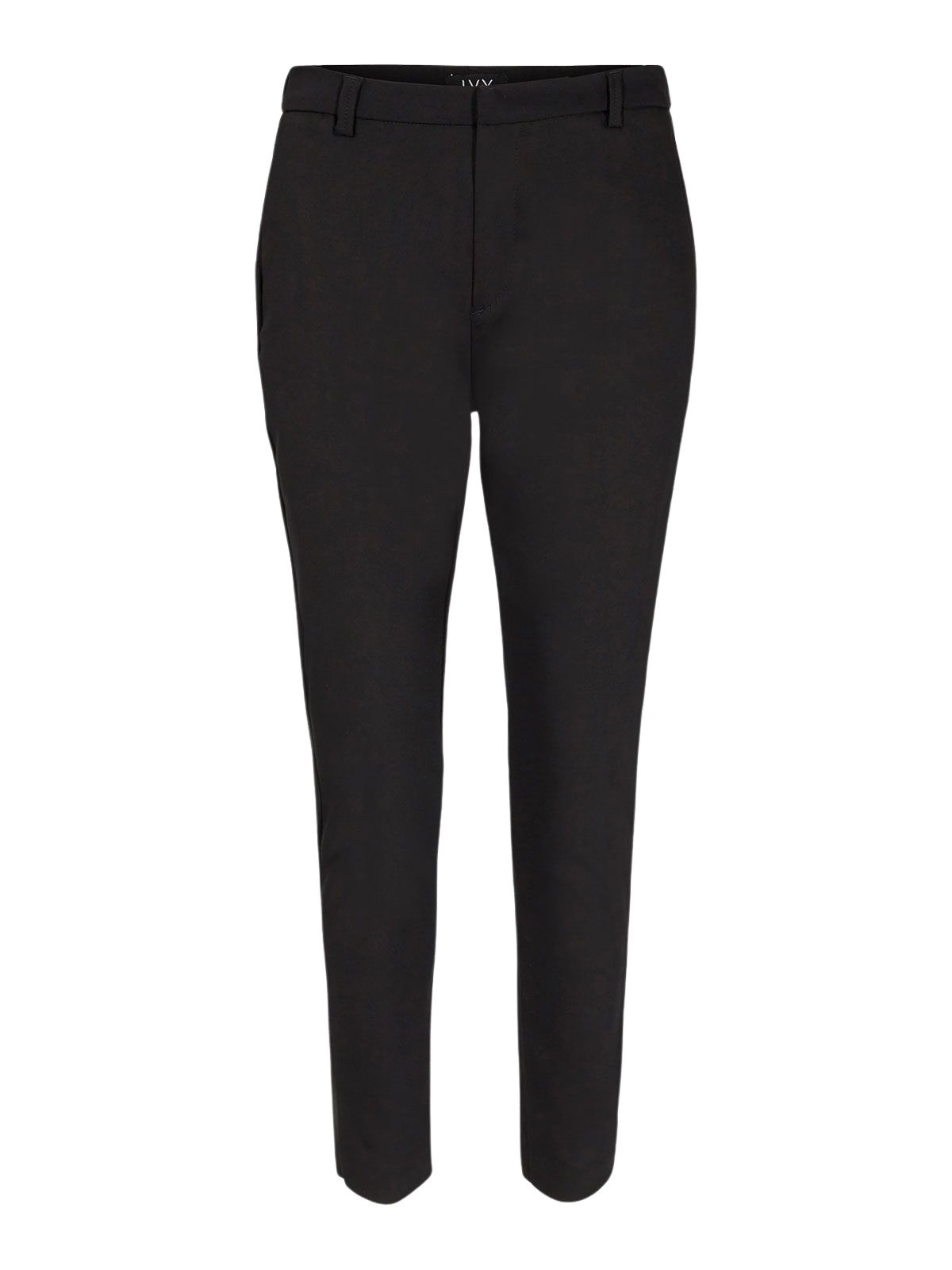 Bukser fra IVY Copenhagen. Bukserne har mellem høj talje og ankel længde. Bukserne har fast talje foran og elastik bagpå. De har stretch og lukkes med lynlås og krog. Tætsiddende pasform. Elegante og behagelige.