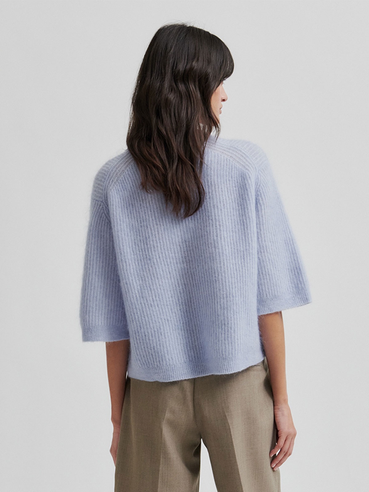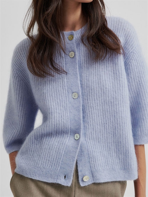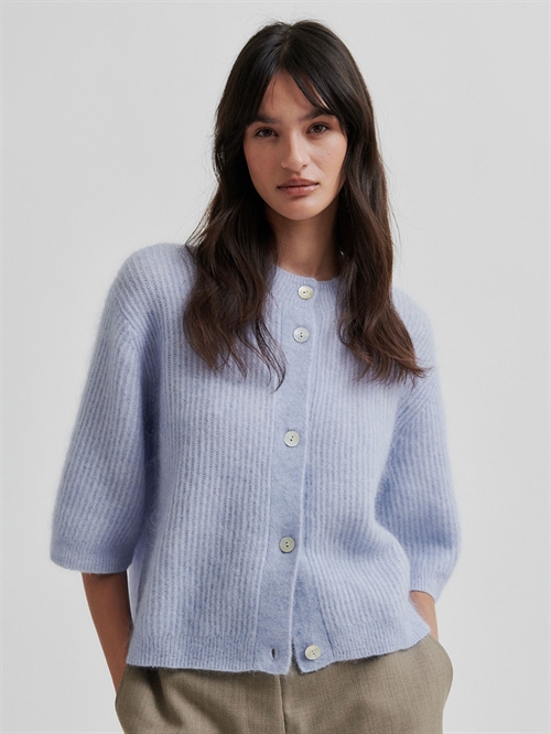 Strikket cardigan fra Second Female. Strikken har rund hals, korte ærmer og lukkes med knapper.