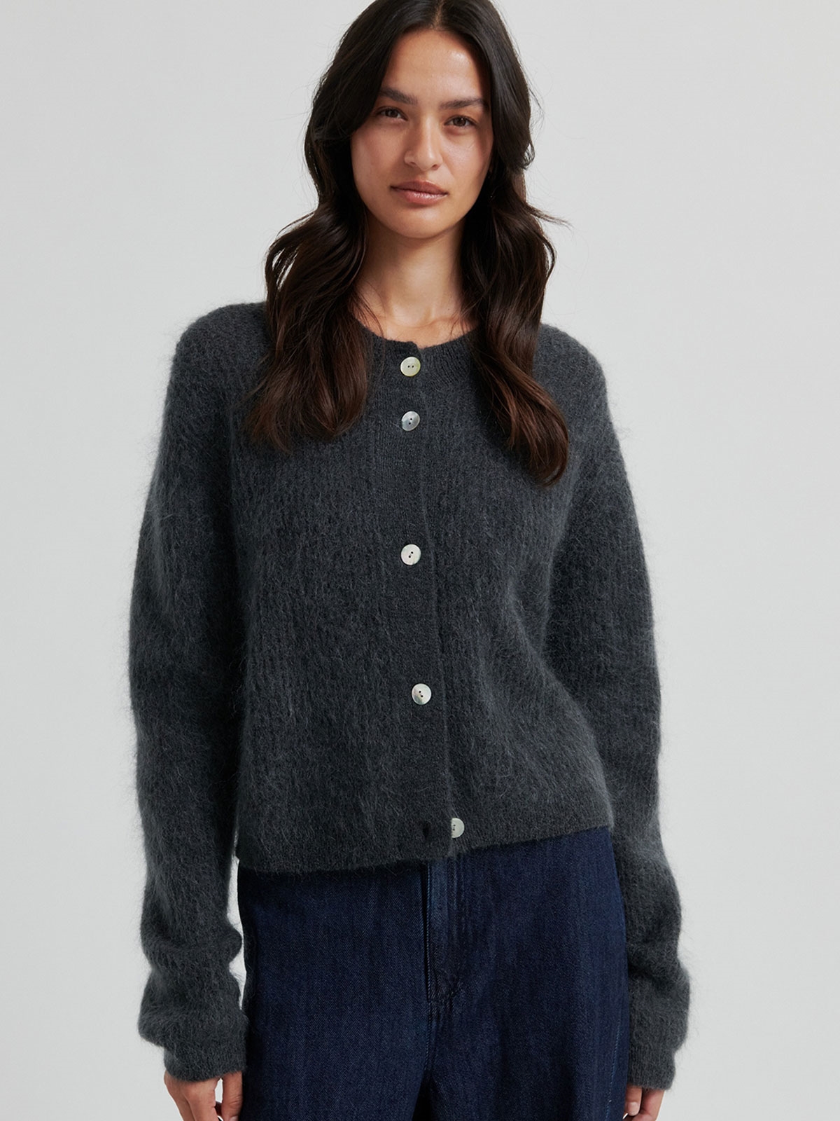 Strikket cardigan fra Second Female. Strikken har rund hals, lange ærmer og lukkes med knapper.