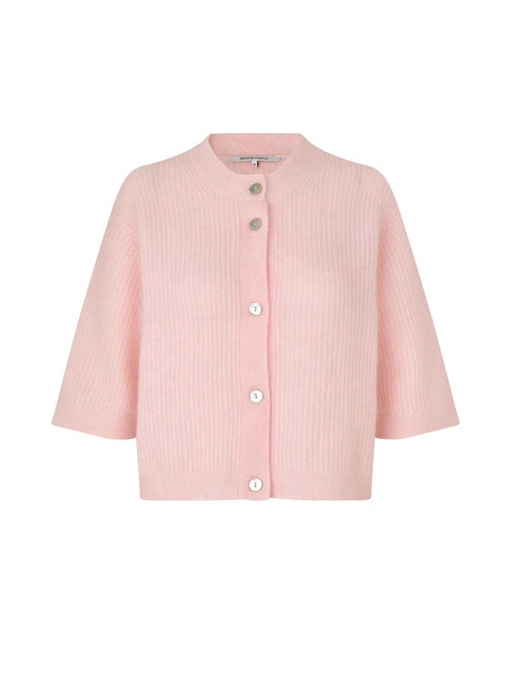 Strikket cardigan fra Second Female. Strikken har rund hals, korte ærmer og lukkes med knapper.