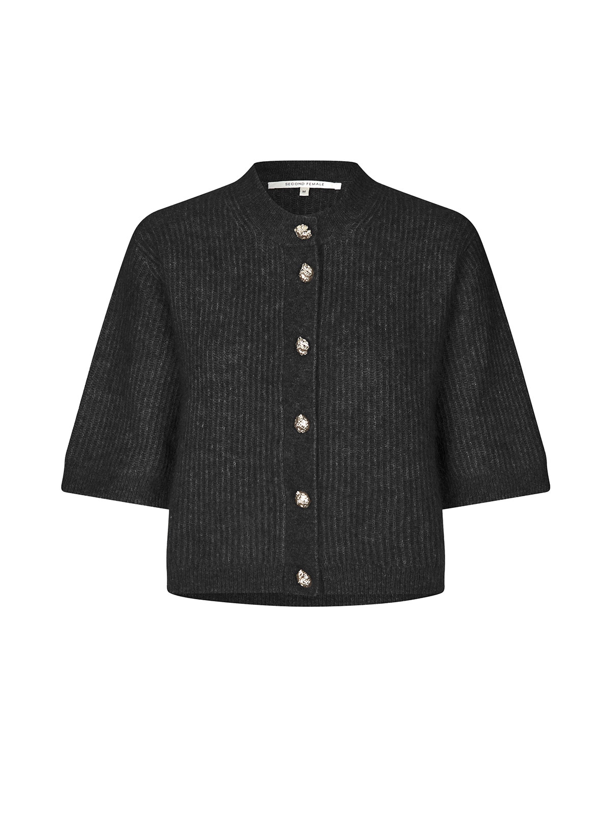 Strikket cardigan fra Second Female. Strikken har rund hals, korte ærmer og lukkes med knapper.