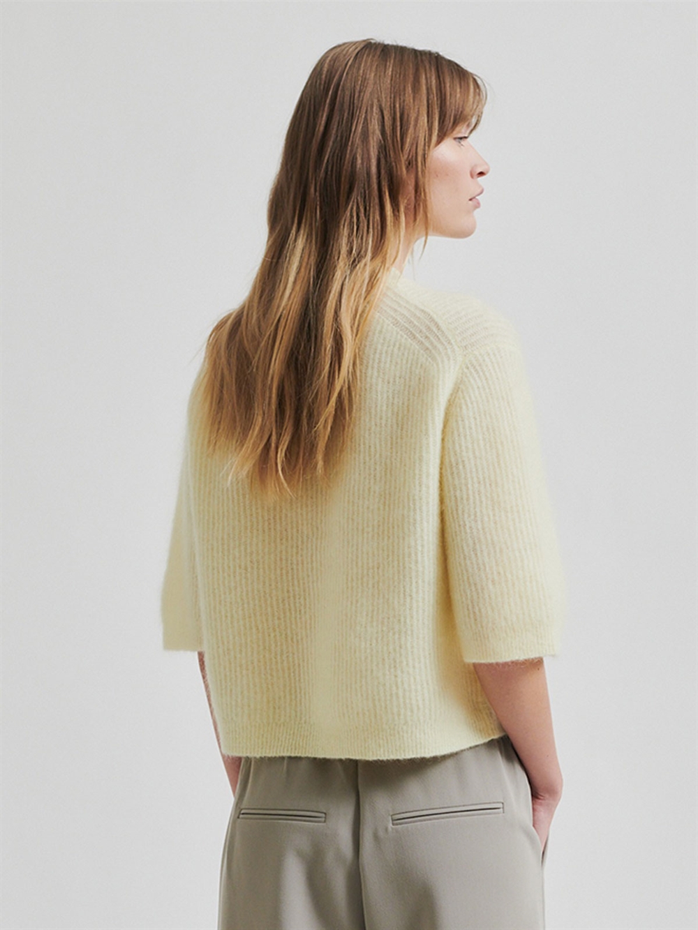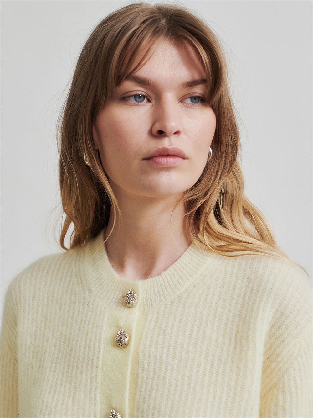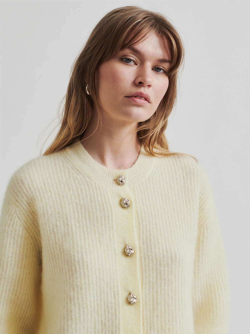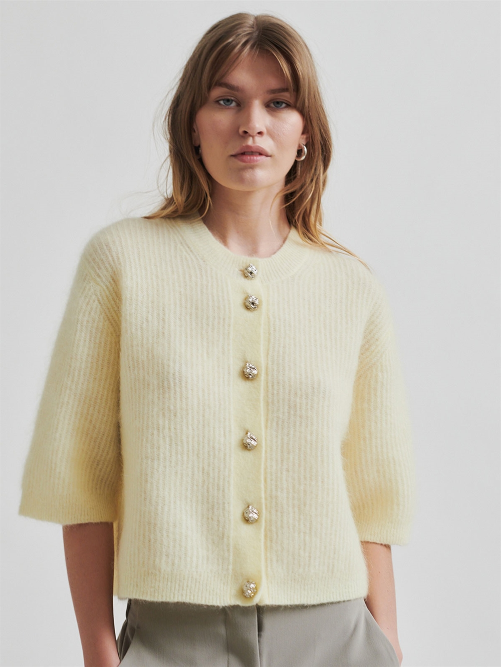 Strikket cardigan fra Second Female. Strikken har rund hals, korte ærmer og lukkes med knapper.