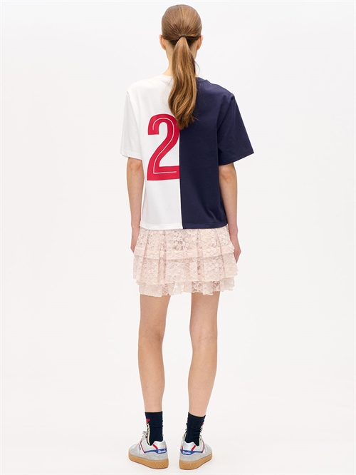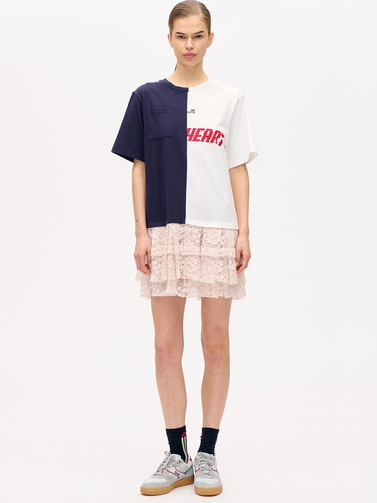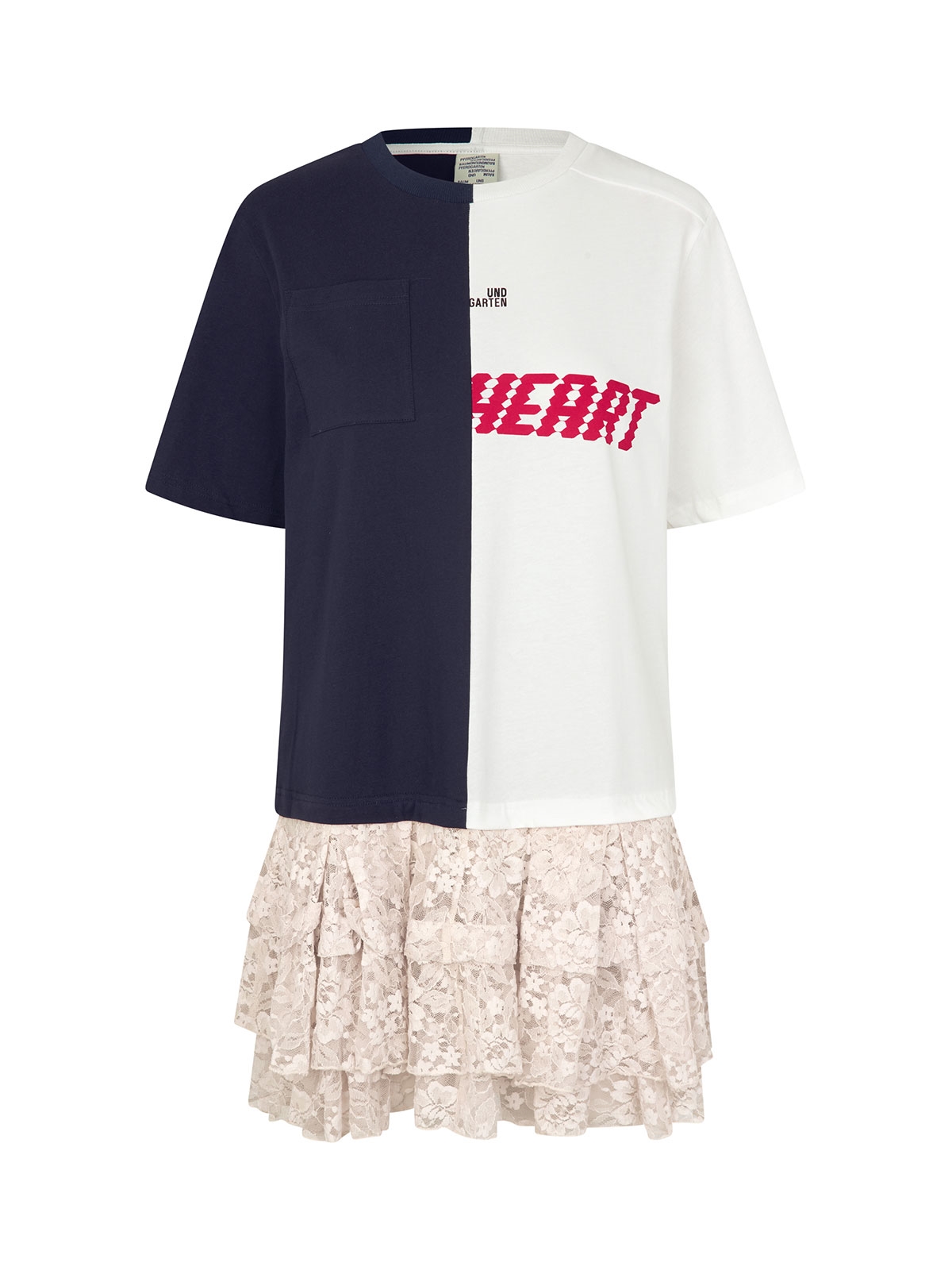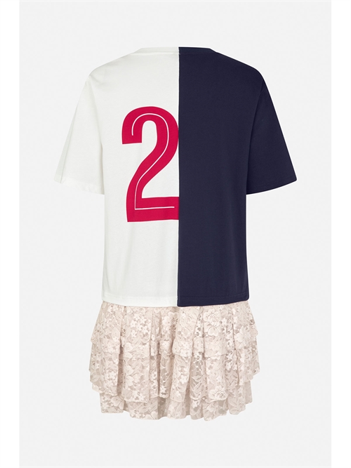Mini kjole fra Baum Und Pferdgarten. Kjolen er designet af en t-shirt-top og en lagdelt blondebund. Den har rund hals, korte ærmer, brystlomme samt tryk på brystet og på ryggen. Afslappet pasform.