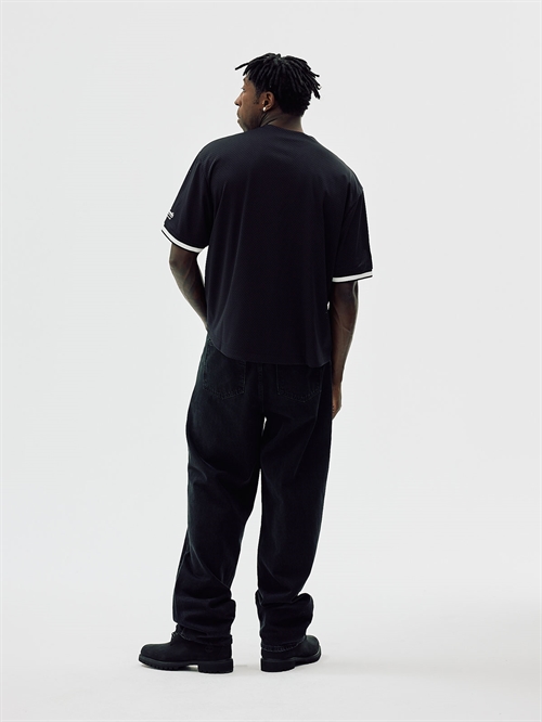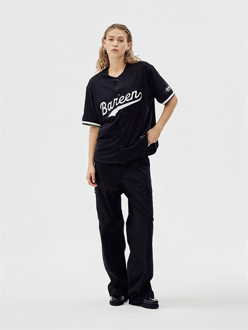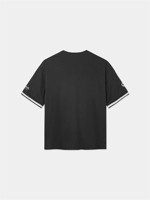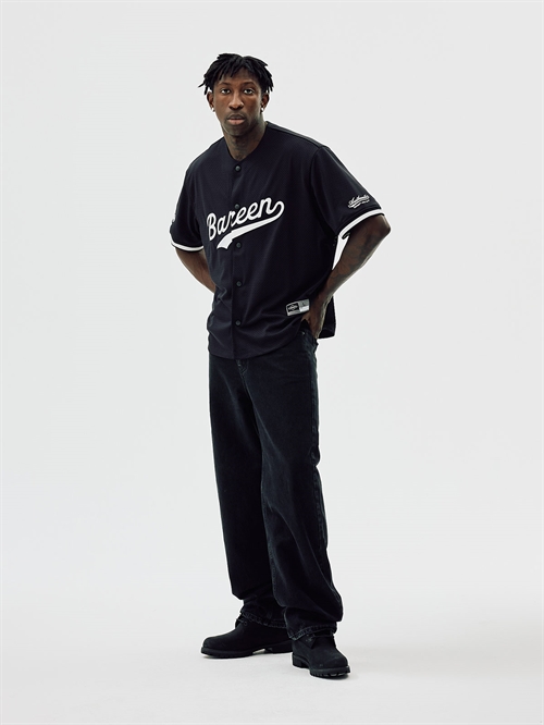 T-shirt fra Bareen. Denne tee har lille v-hals, korte ærmer og lukkes med knapper. Den har logo på brystet.