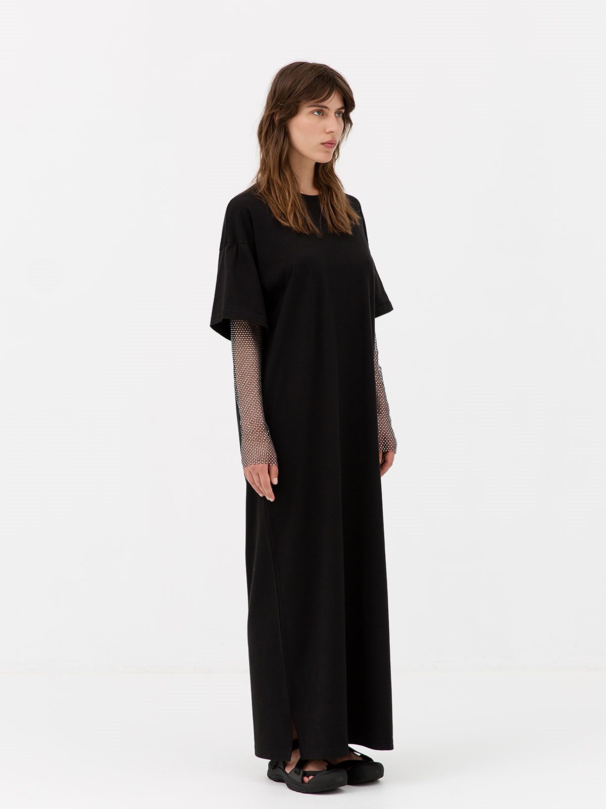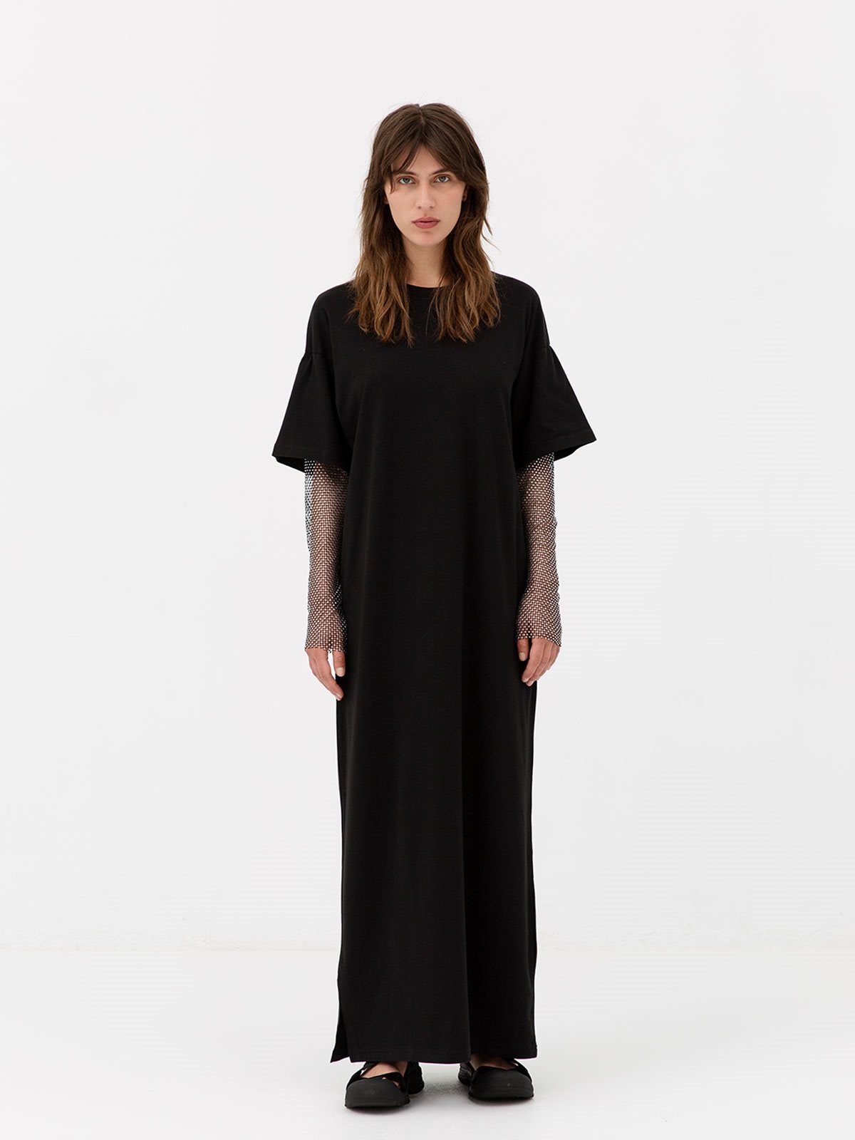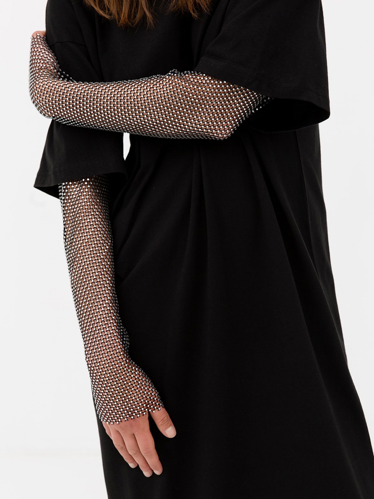 T-shirt kjole fra H2OFagerholt. Kjolen har rund hals og korte ærmer med lange net ærmer under besat med sten  Den har broderet logo i nakken. Normal pasform.