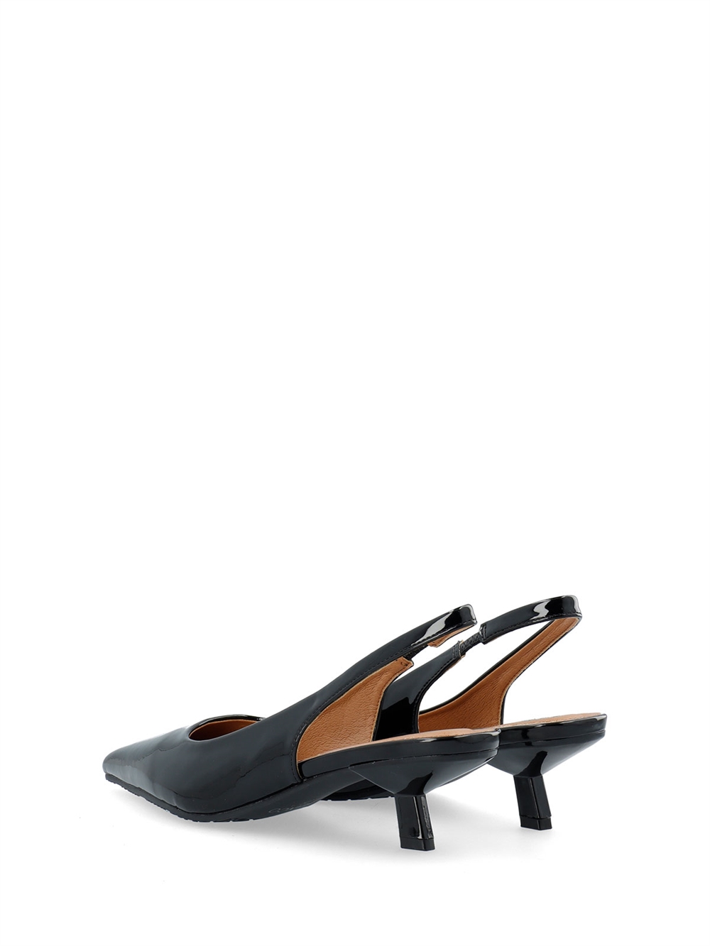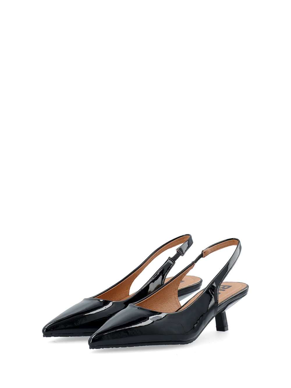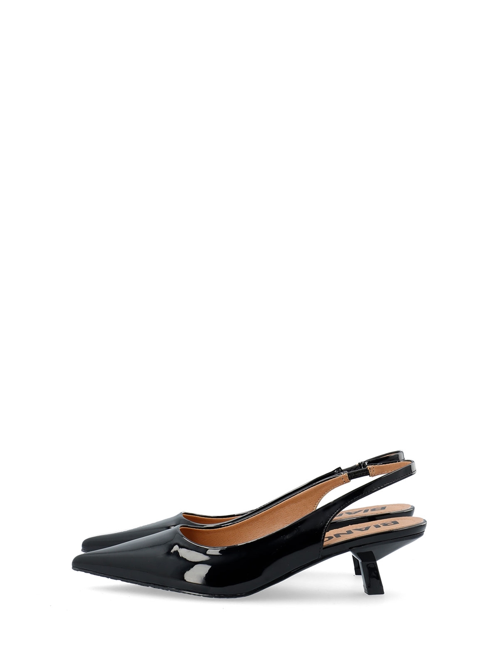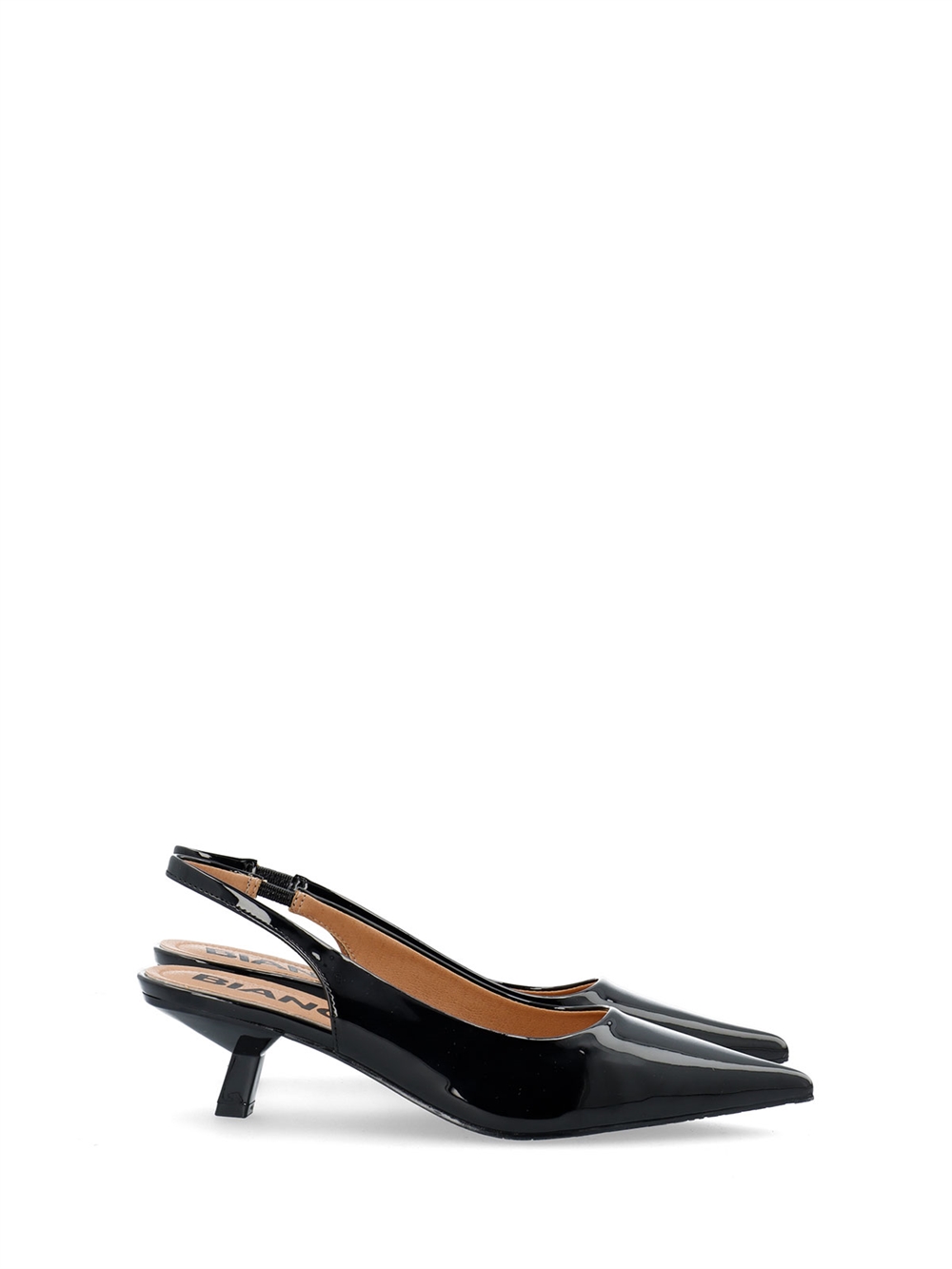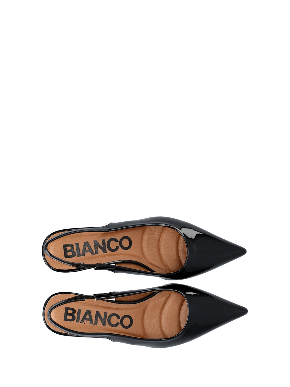 Slingback sko fra Bianco. Skoen har spids snude, er blank og har en mellemhøj hæl. De har en elastisk slingback-strop og lavet imiteret patenteret overlæder.