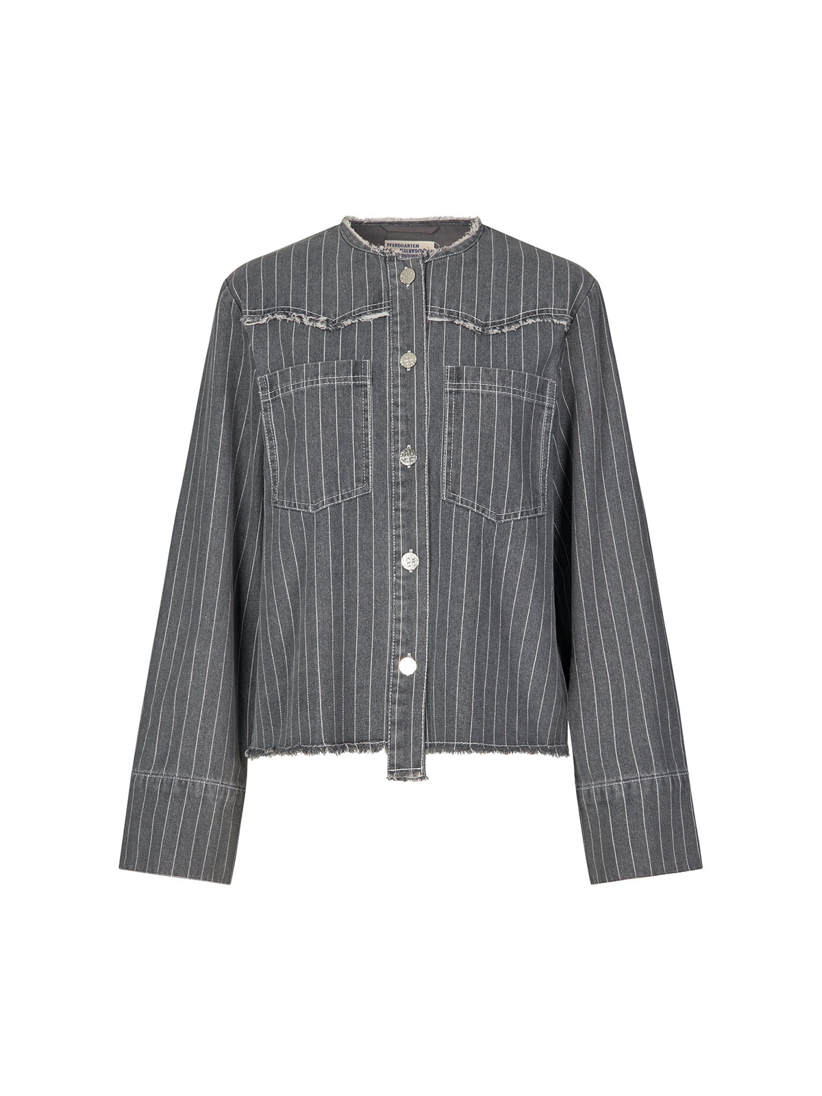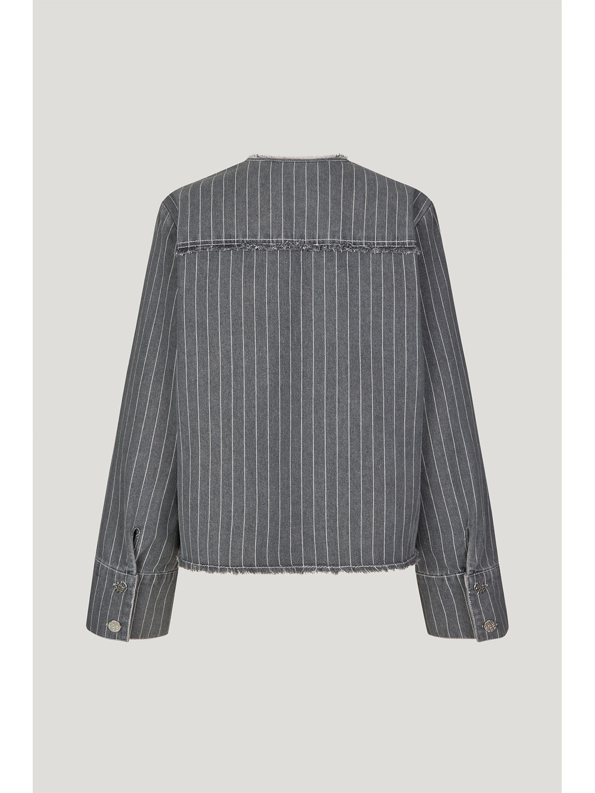 Denim jakke fra Baum Und Pferdgarten. Jakken har rund flosset hals og den lukkes med knapper. Den har også flosset kant nederst samt på kant ved bærestykket. Den har to påsyede brystlommer. Løs pasform.