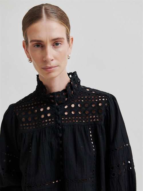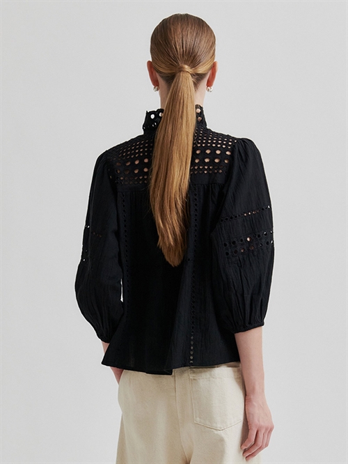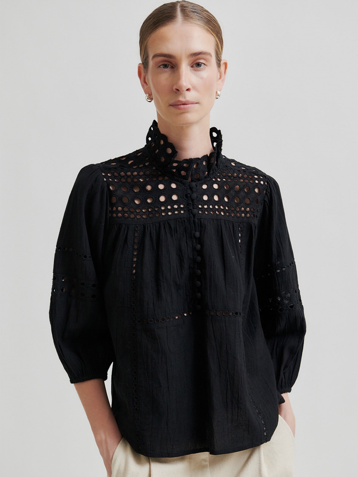Bluse med blonde fra Second Female. Denne bluse har høj  hals, korte ærmer og stolpelukning. Løs pasform.