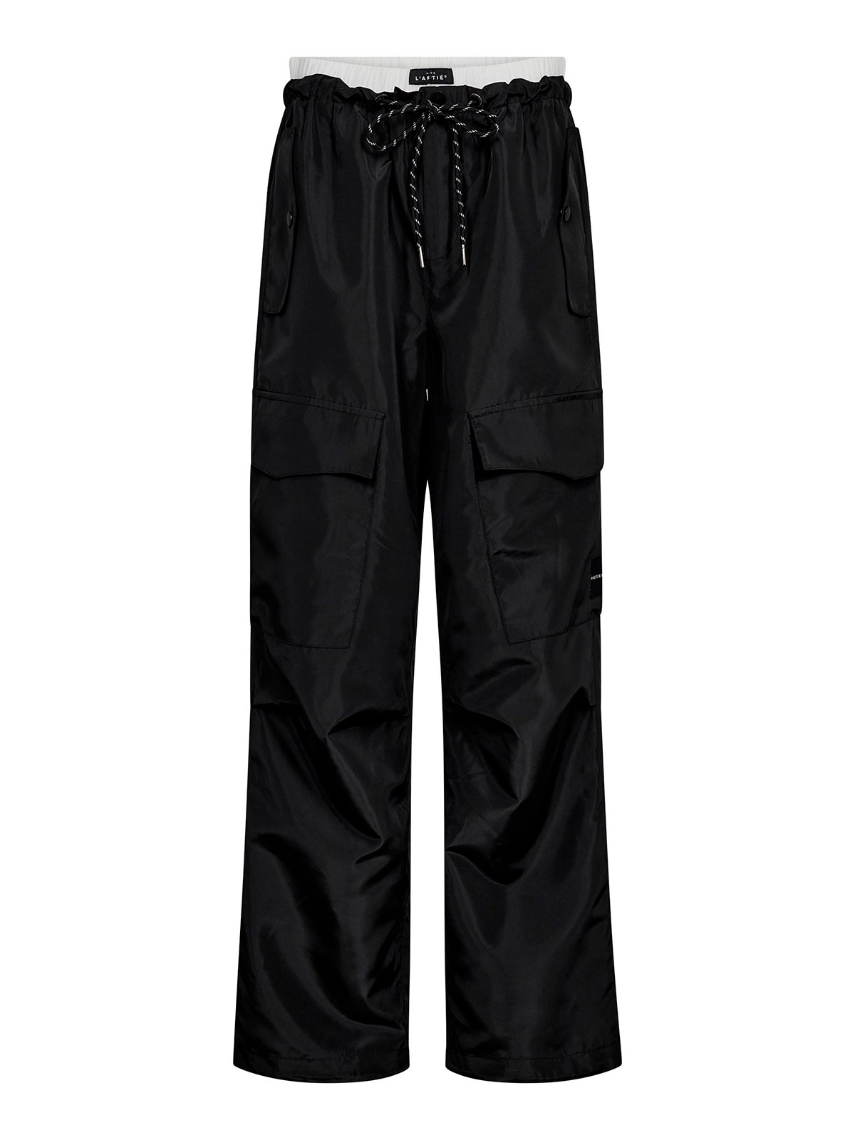 Bukser fra Haute L'Amitié. Disse bukser har hvid elastikkant i taljen med logo påsyet og snørrer. De har lige vide ben med påsyet lommer på siderne. Bukserne har logo på siden og justerbar elastik ved anklerne.