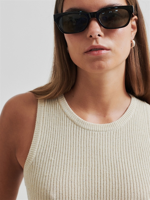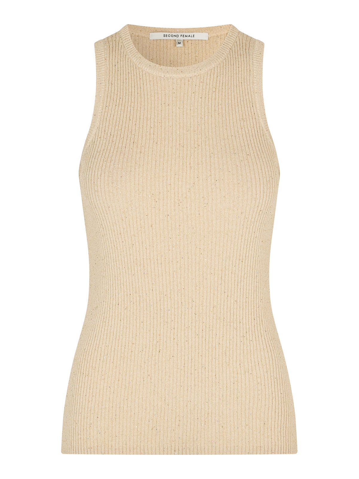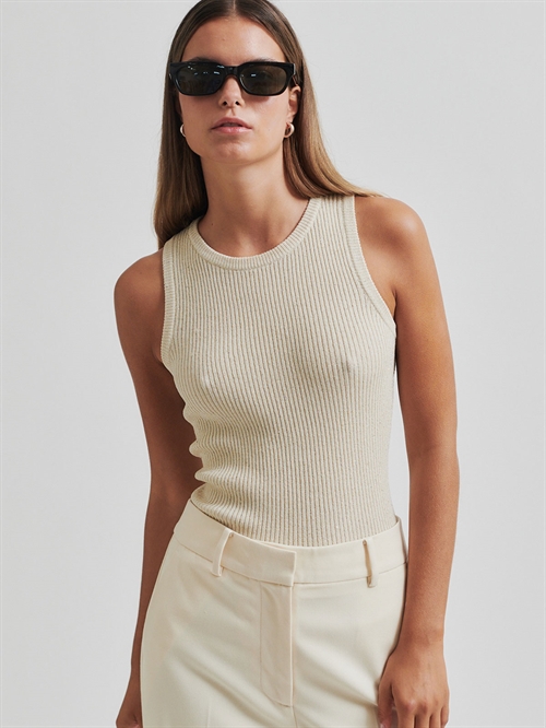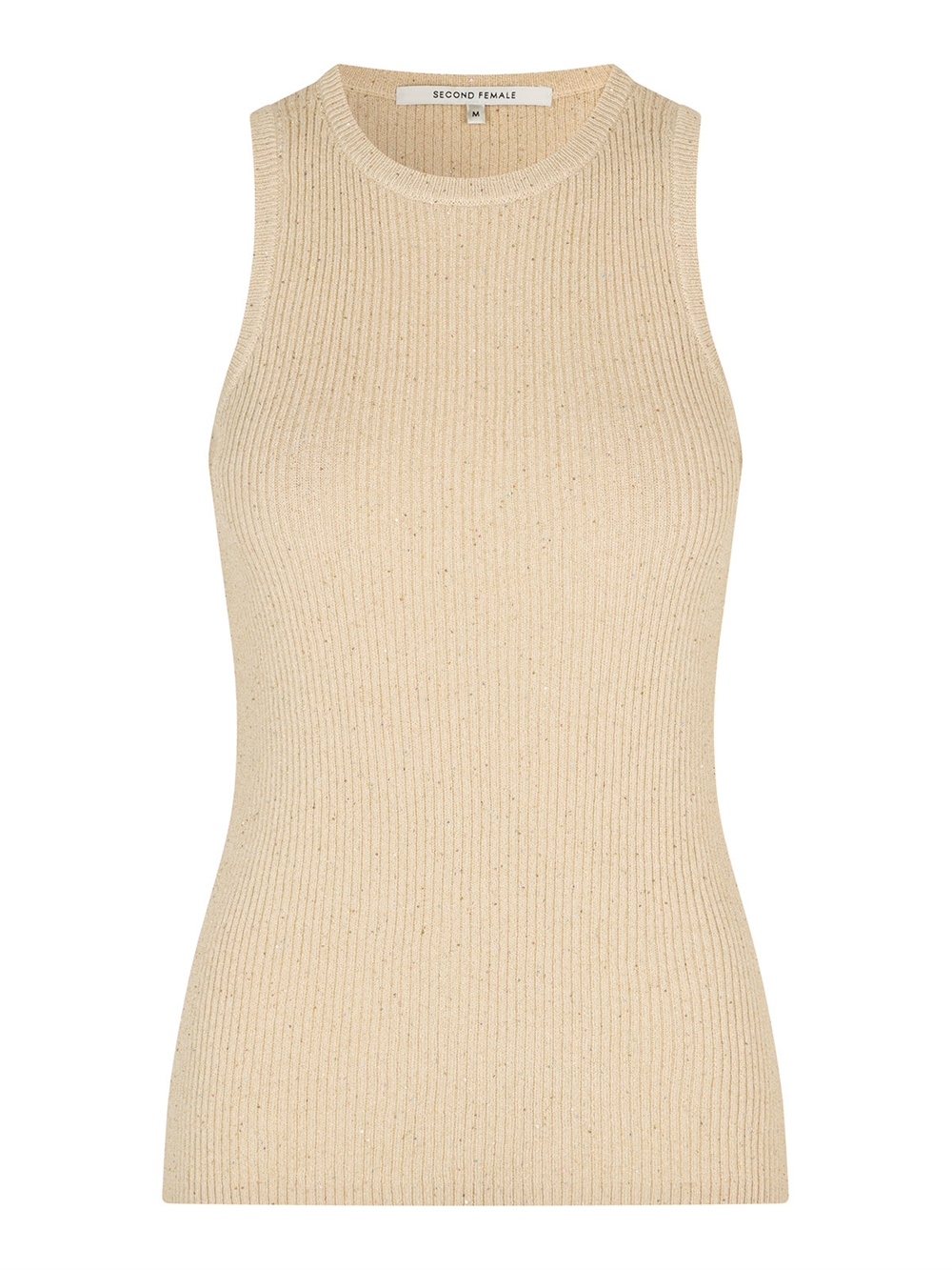 Strikket top fra Second Female. Denne tank top har rund hals og ribkant ved hals og ærmegab. Den er lavet i en blød bomuldsblanding og har stretch. Tætsiddende pasform