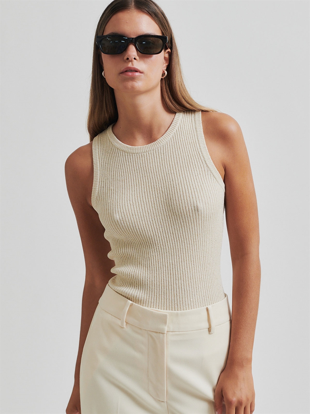 Strikket top fra Second Female. Denne tank top har rund hals og ribkant ved hals og ærmegab. Den er lavet i en blød bomuldsblanding og har stretch. Tætsiddende pasform