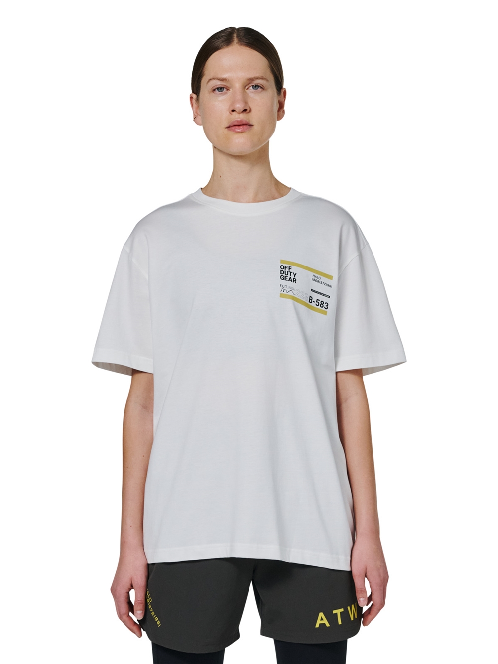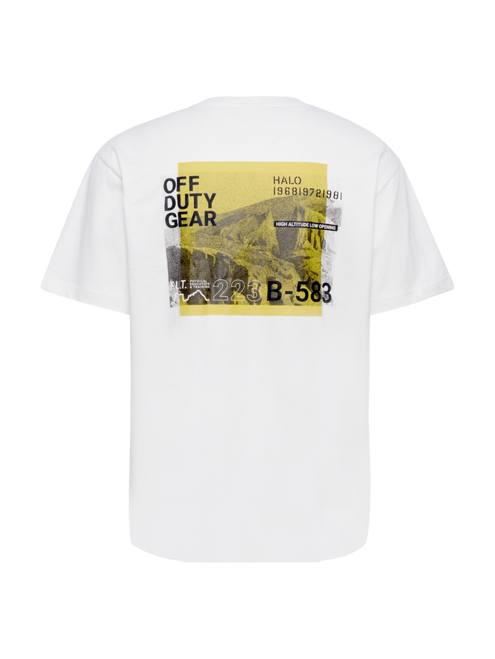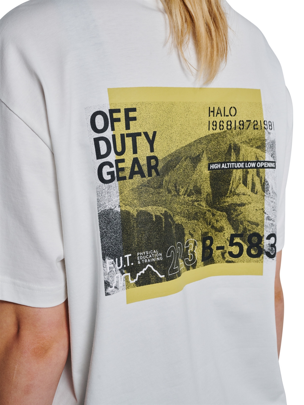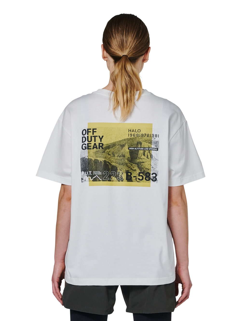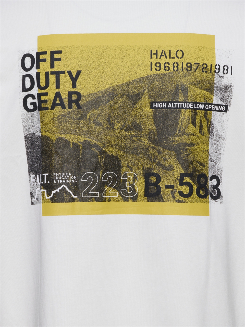 T-shirt fra HALO. T-shirten har rund hals og korte ærmer. Den har logo print på brystet og stort tryk på ryggen