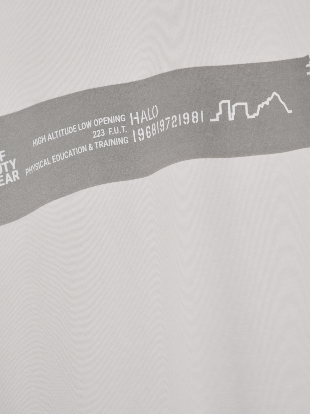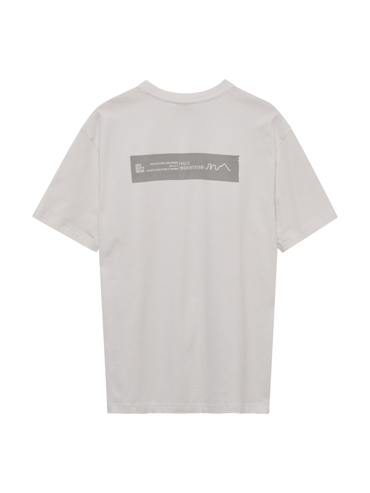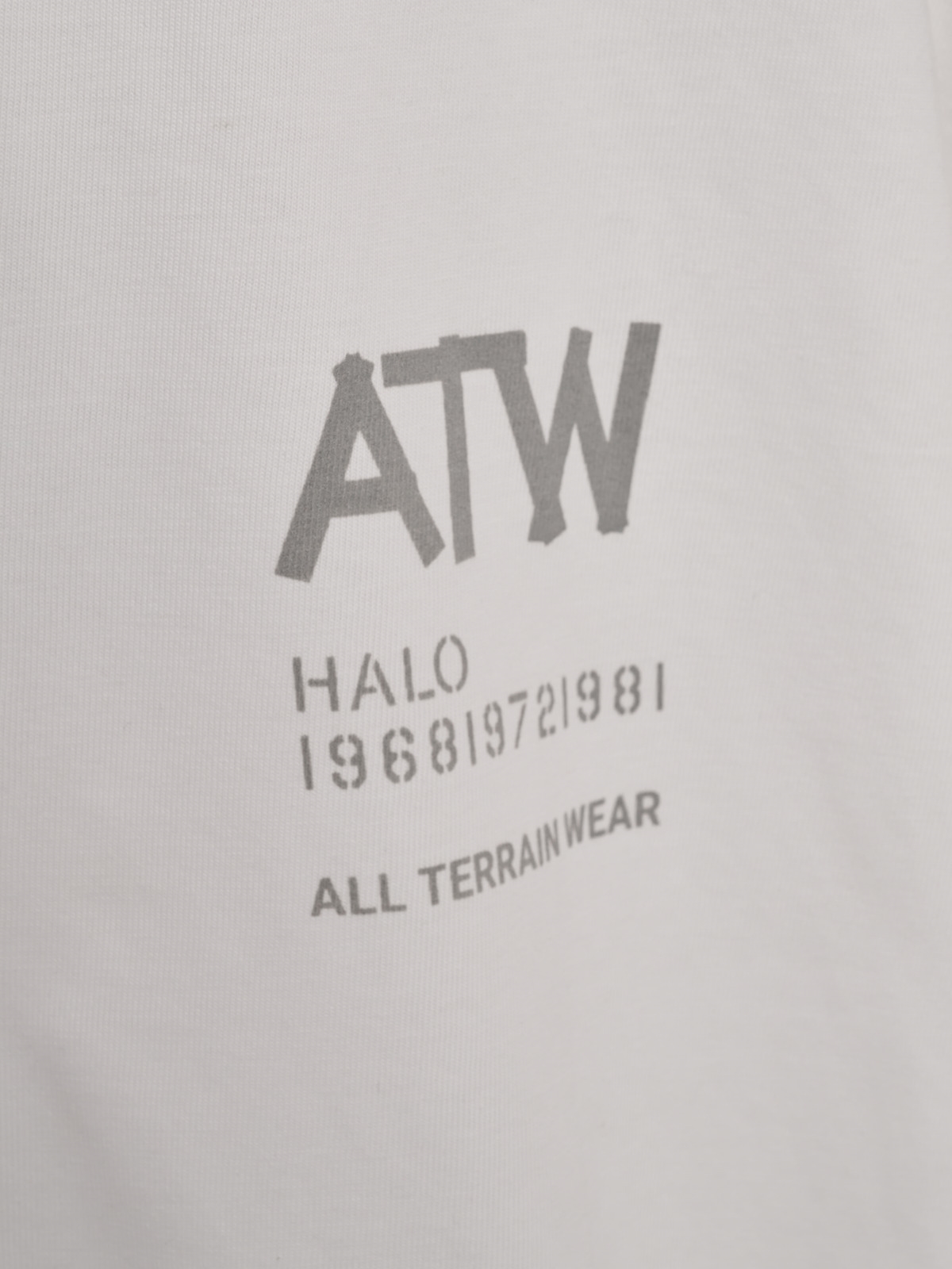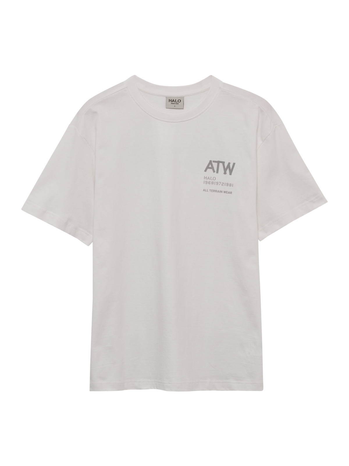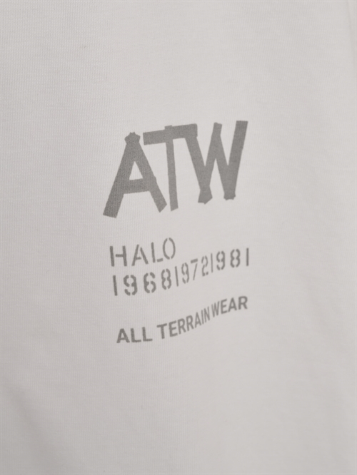 T-shirt fra HALO. T-shirten har rund hals og korte ærmer. Den har logo print på brystet og stort tryk på ryggen