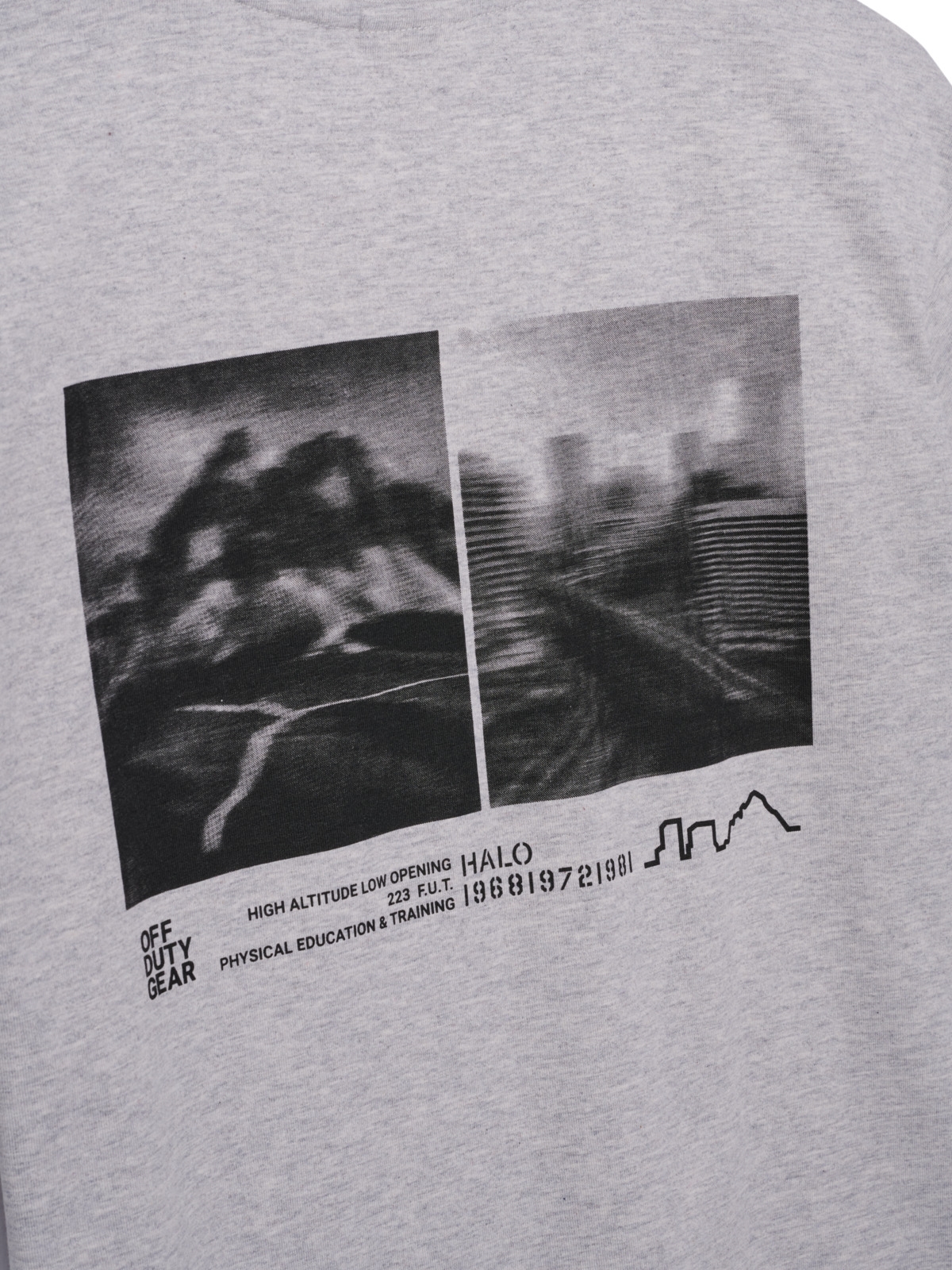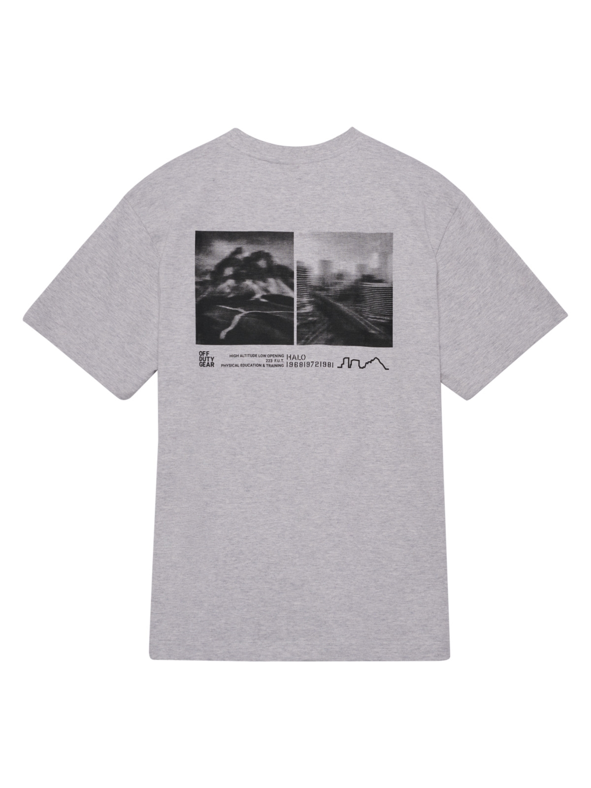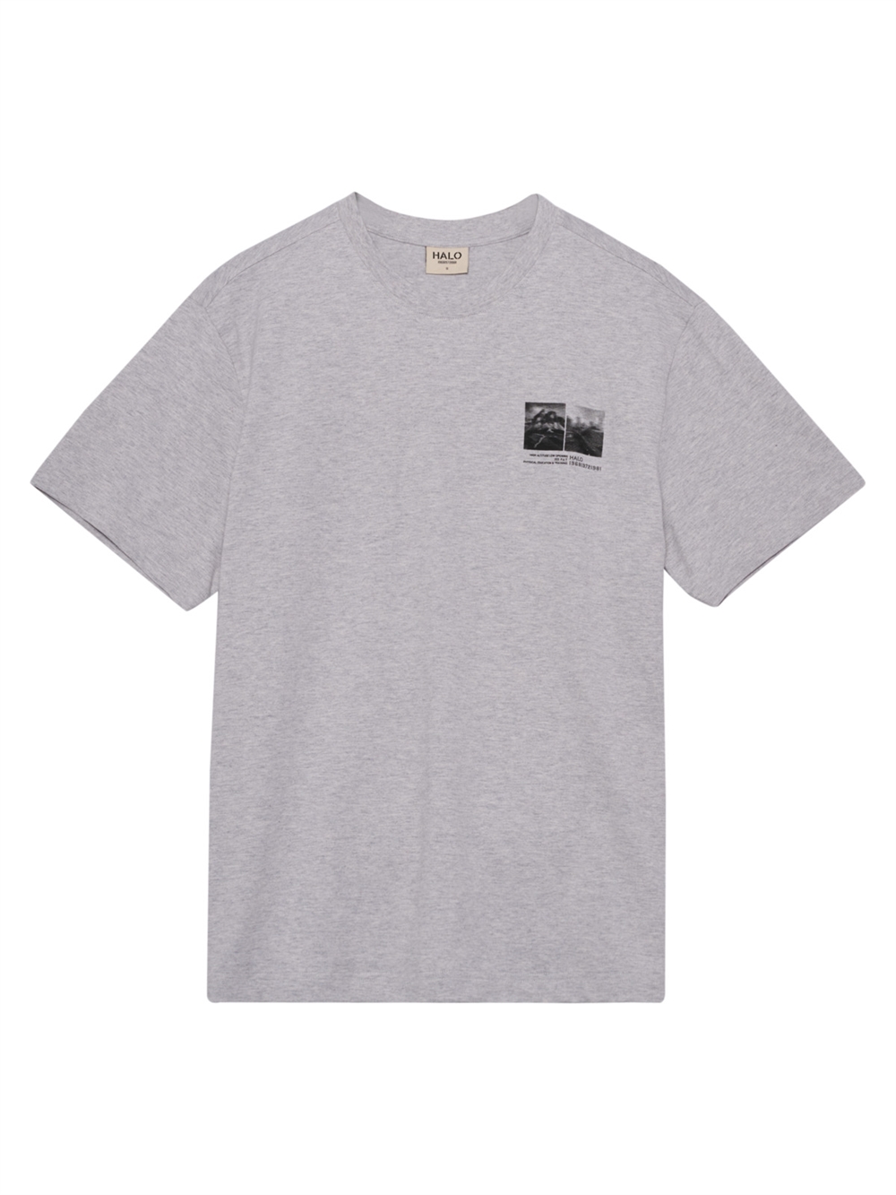 T-shirt fra HALO. T-shirten har rund hals og korte ærmer. Den har logo print på brystet og stort tryk på ryggen