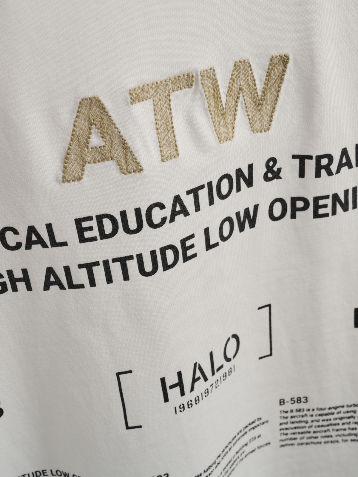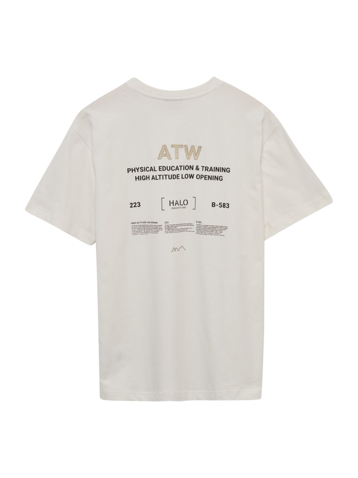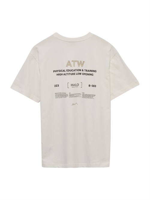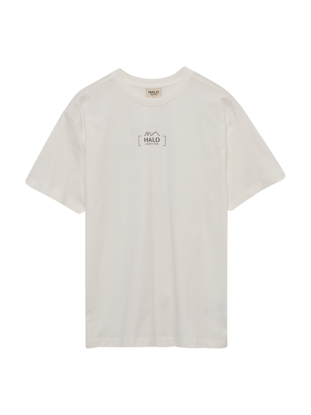 T-shirt fra HALO. T-shirten har rund hals og korte ærmer. Den har logo print på brystet og stort tryk på ryggen