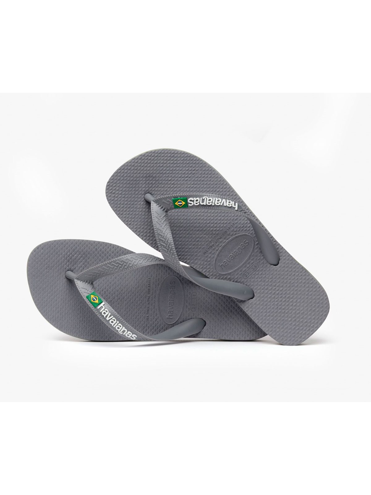 Flip flops fra Havaianas. Denne model er grå med striber i sålen. De er vandafvisende og har en blød og behagelig sål som også er skridsikker. Klip klapperne har logo samt det brazilianske flag på stroppen.