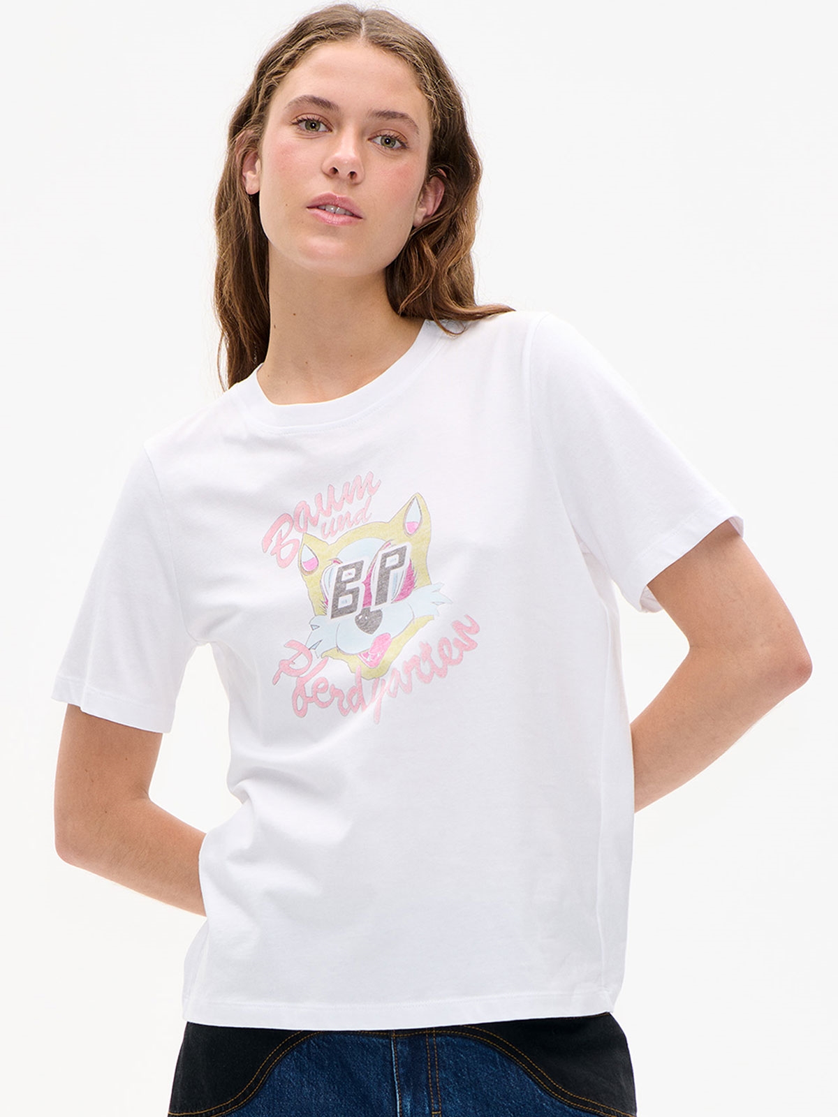 T-shirt fra Baum Und Pferdgarten. T-shirten har rund hals, korte ærmer og tryk på brystet. Normal pasform.