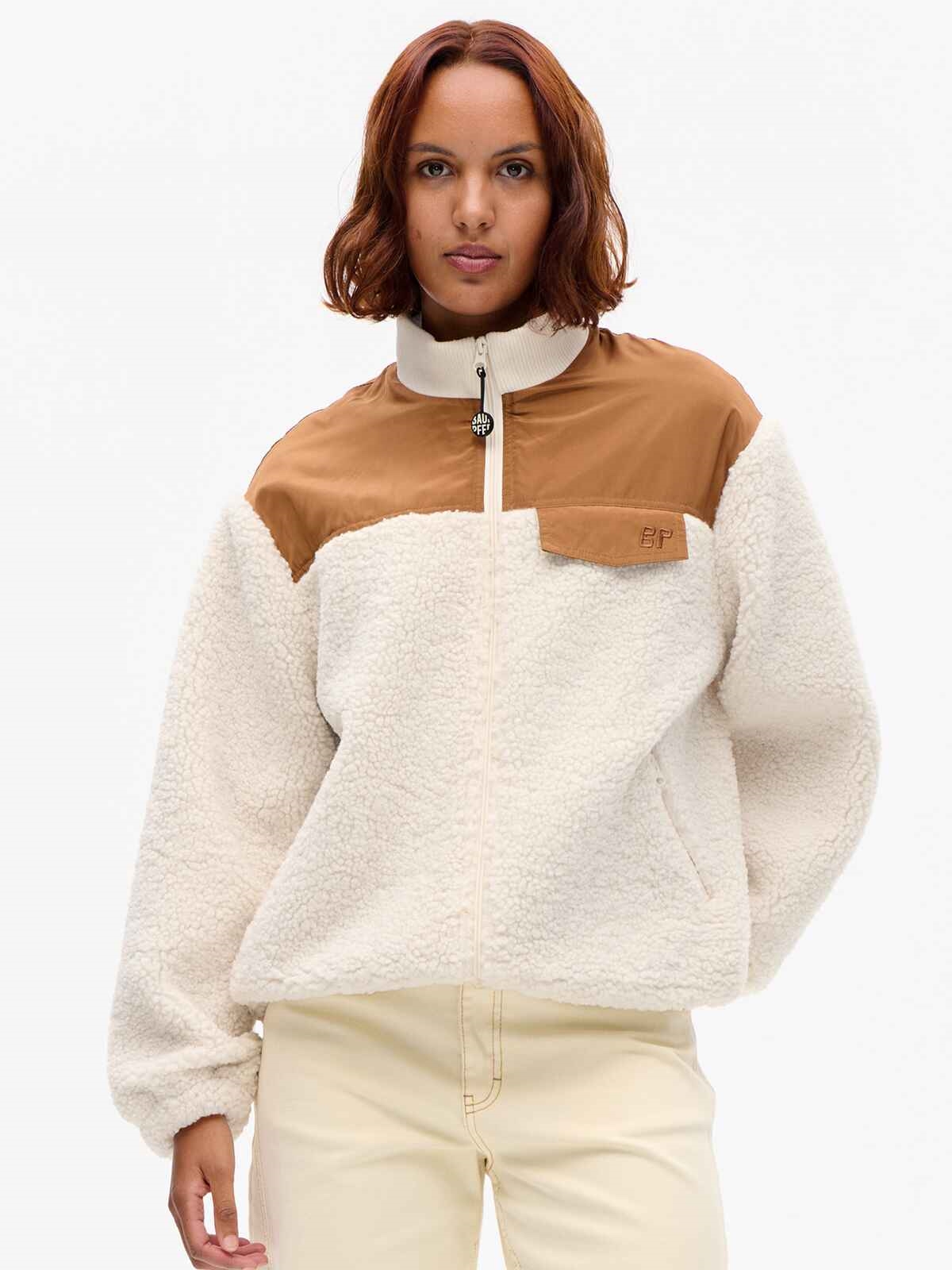 Jakke i blød fleece fra Baum Und Pferdgarten. Jakken har elastik kanter, stående ribbet krave og den lukkes med to-vejs lynlås. Den har lommer i siderne der lukkes med lynlås samt pyntelomme med logo på brystet. Løs pasform med dropped shoulders.