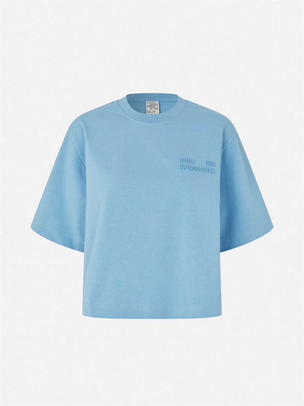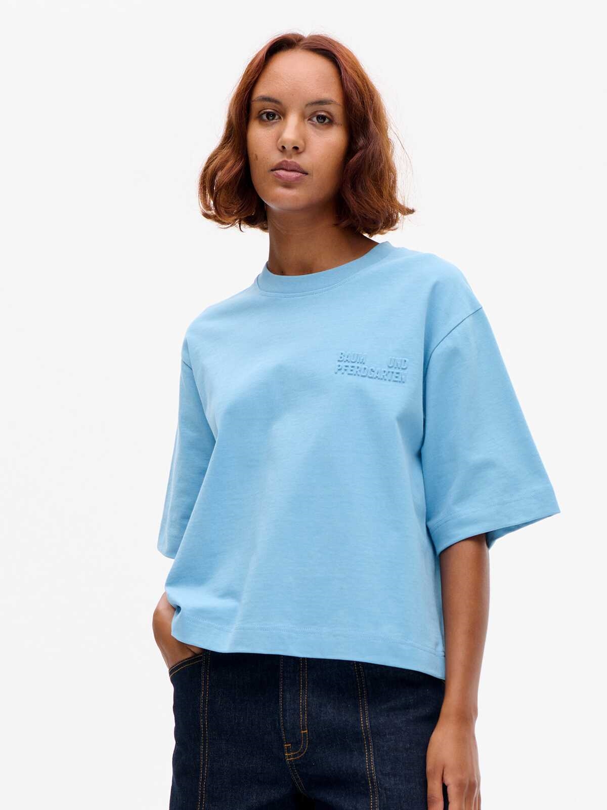 T-shirt fra Baum Und Pferdgarten. Blusen har korte off-shoulder ærmer og præget logo på brystet. Den har en løs kort oversize pasform og lavet i en tung og blød økologiske bomuld.