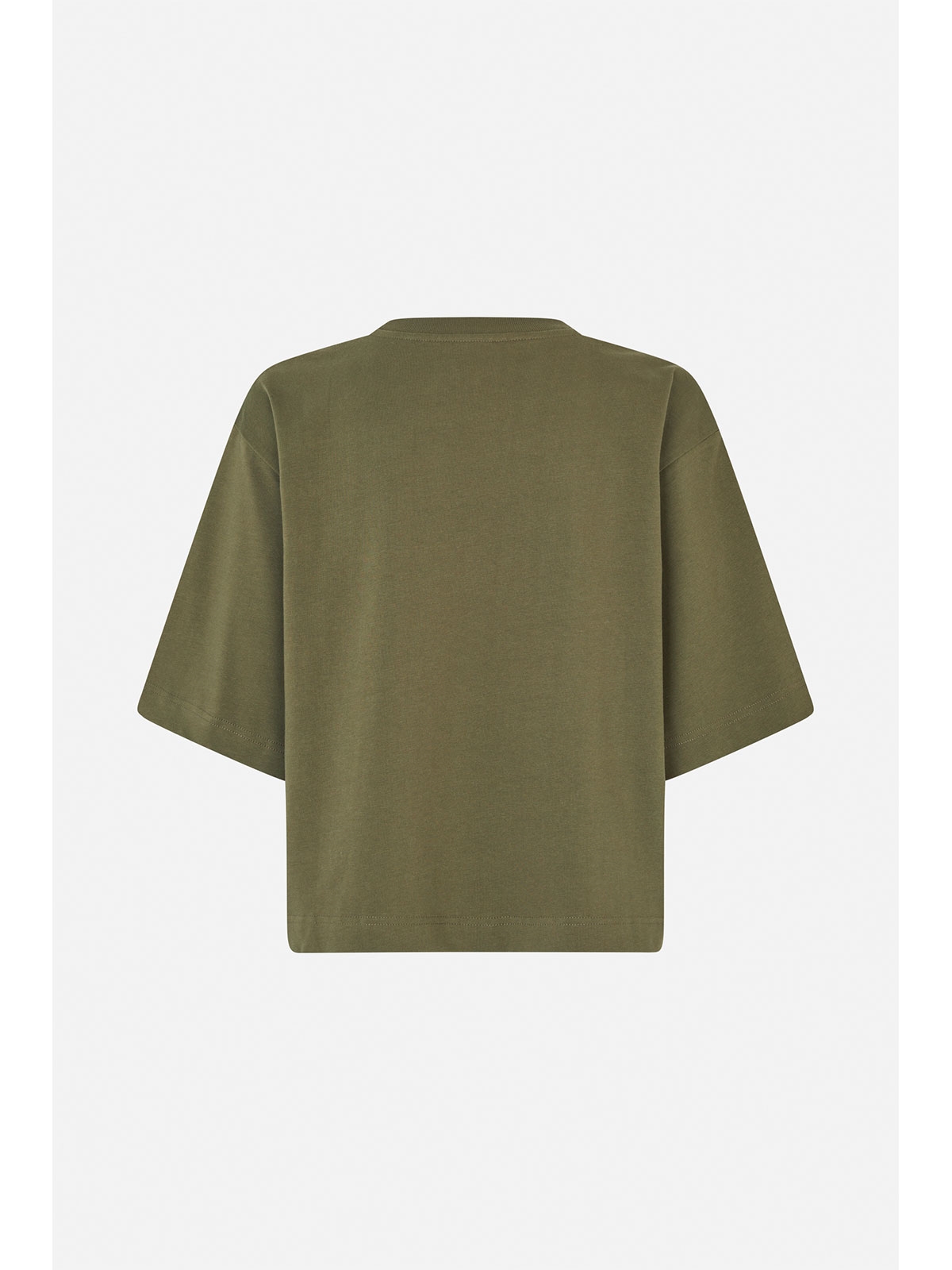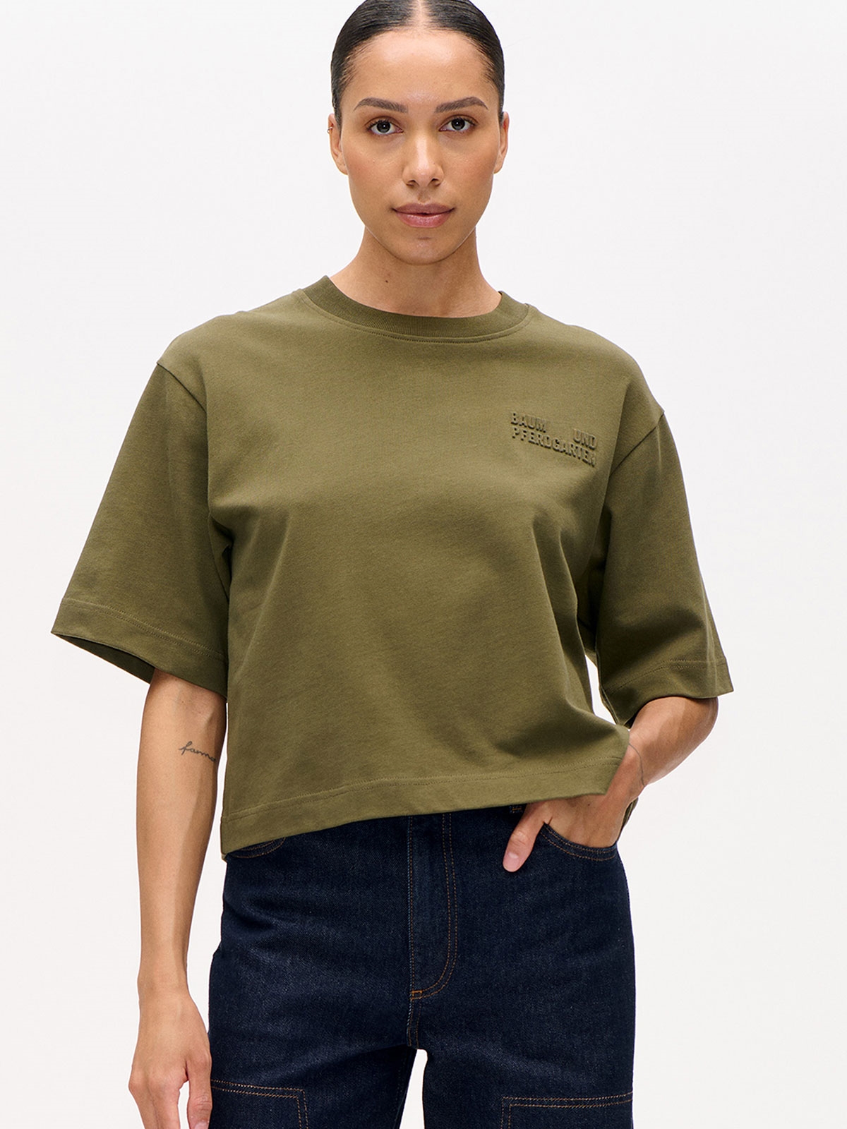 T-shirt fra Baum Und Pferdgarten. Blusen har korte off-shoulder ærmer og præget logo på brystet. Den har en løs kort oversize pasform og lavet i en tung og blød økologiske bomuld.