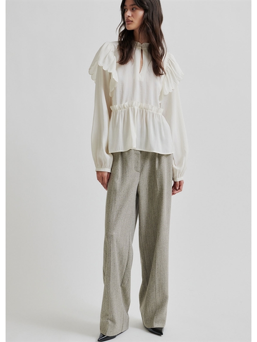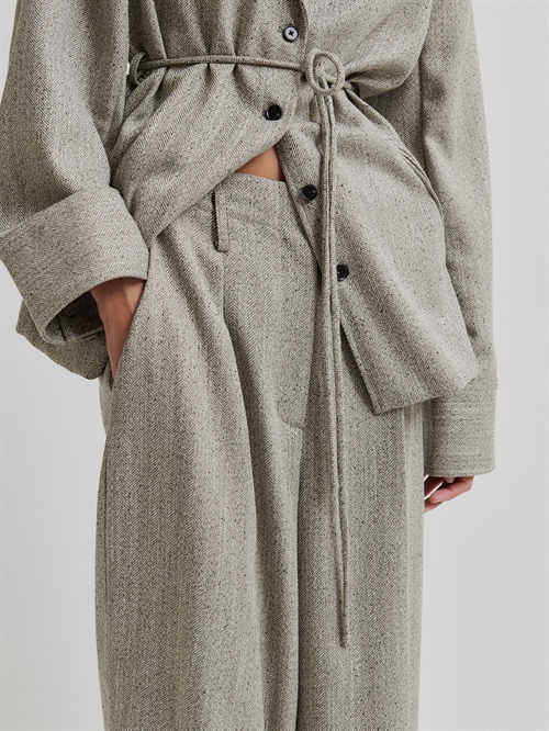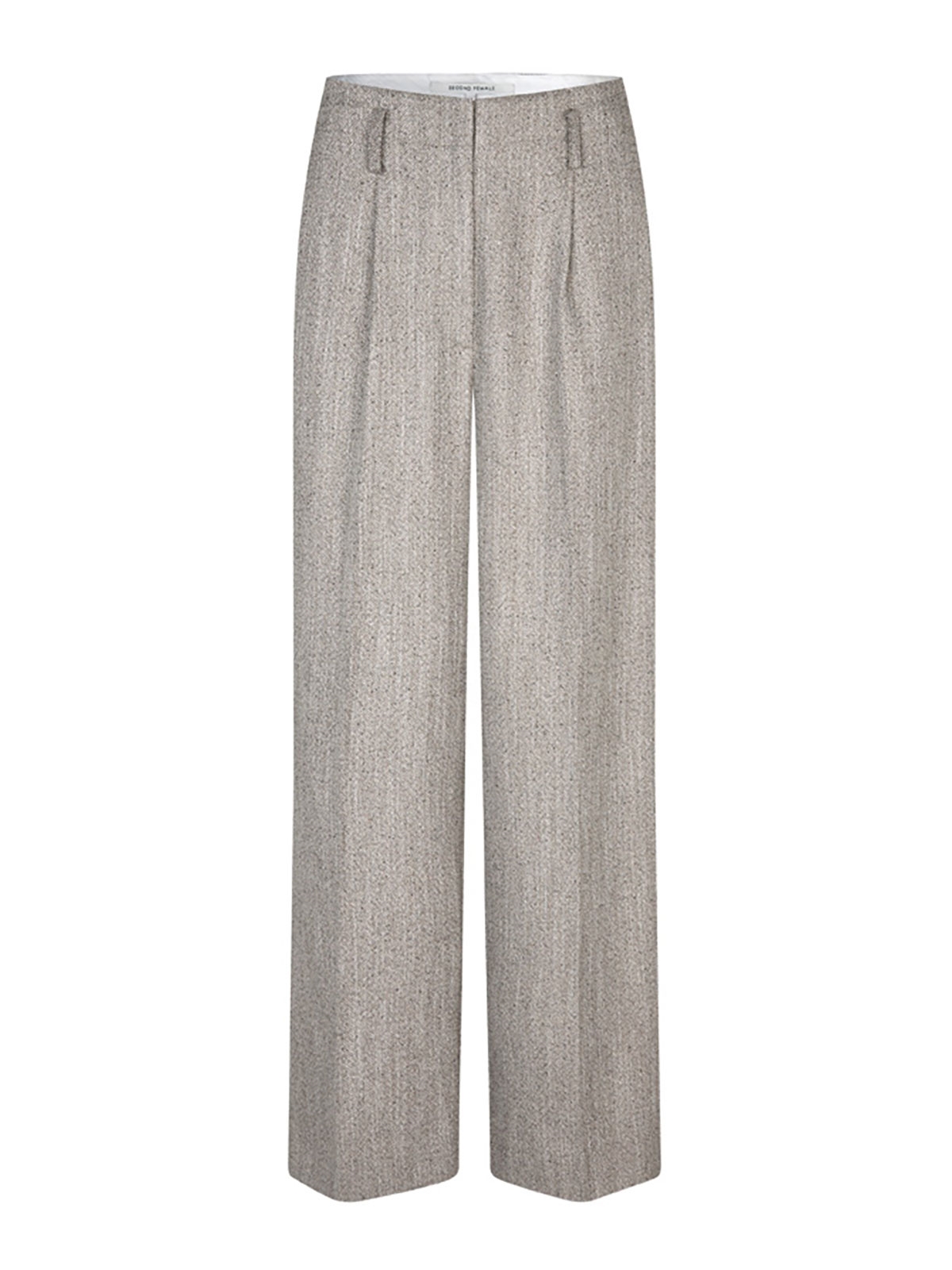 Bukser med læg fra Second Female. Bukserne har mellemhøj talje med bæltestropper, læg ved linningen og to skrå lommer i siderne. De lukkes med skjult lynlås-, hægte- og knaplukning. Bukserne er i blødt materiale med sildebensmønster. De har lige vide ben og afslappet pasform.
