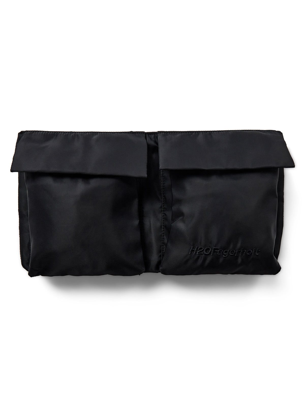 Taske fra H2OFagerholt. Tasken har to rum foran, der lukkes med knap, samt en lynlåslomme bagpå. Remmen lukkes med et spænde og kan justeres så den både kan bruges som crossbody og som bæltetaske. Tasken har logo broderet i sort foran.