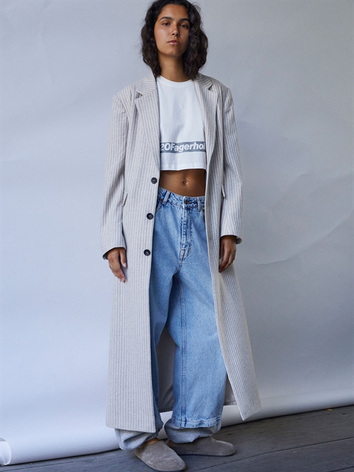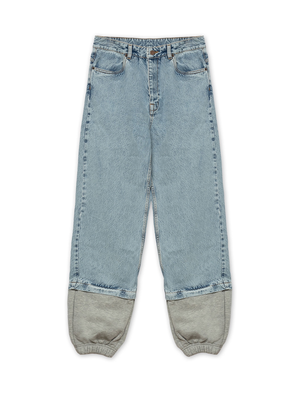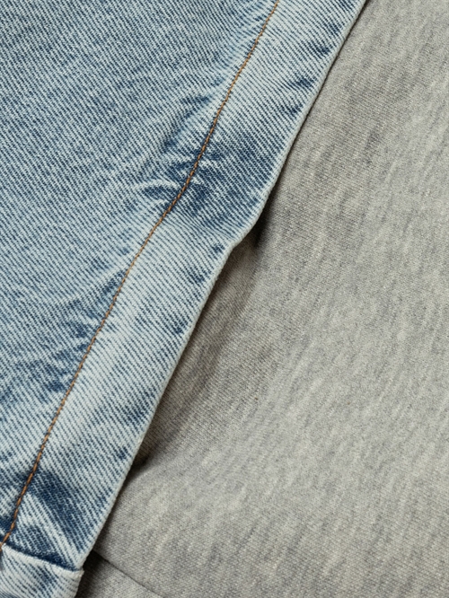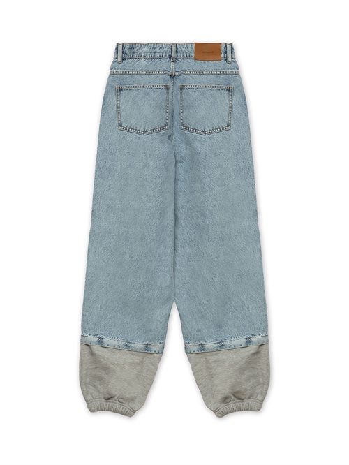Jeans fra H2OFagerholt. Bukserne har fire lommer samt stykke med sweat materiale nederst ved anklerne. Logo på læder bagpå. De lukkes med lynlås og knap. Løs pasform.