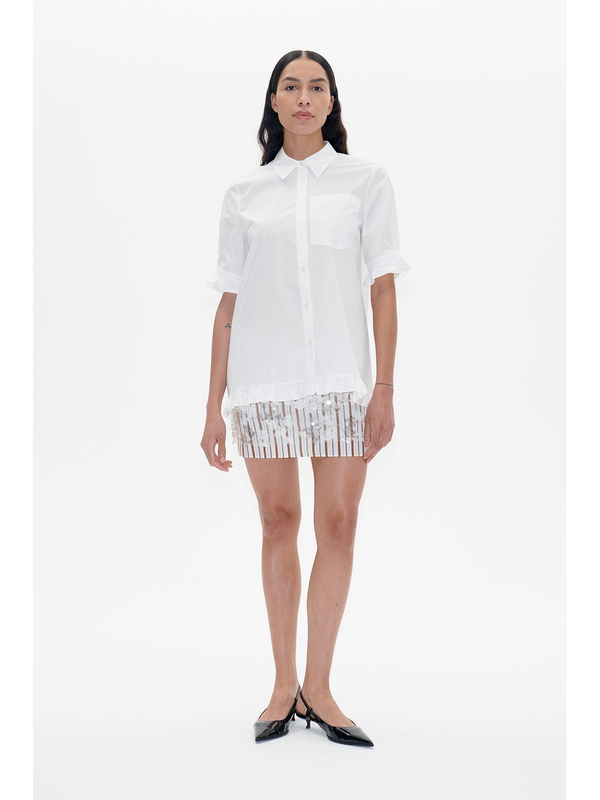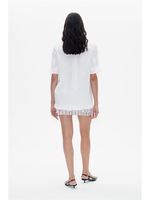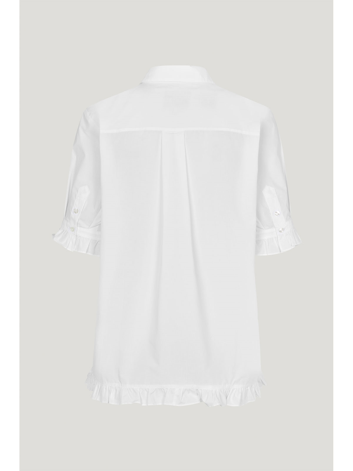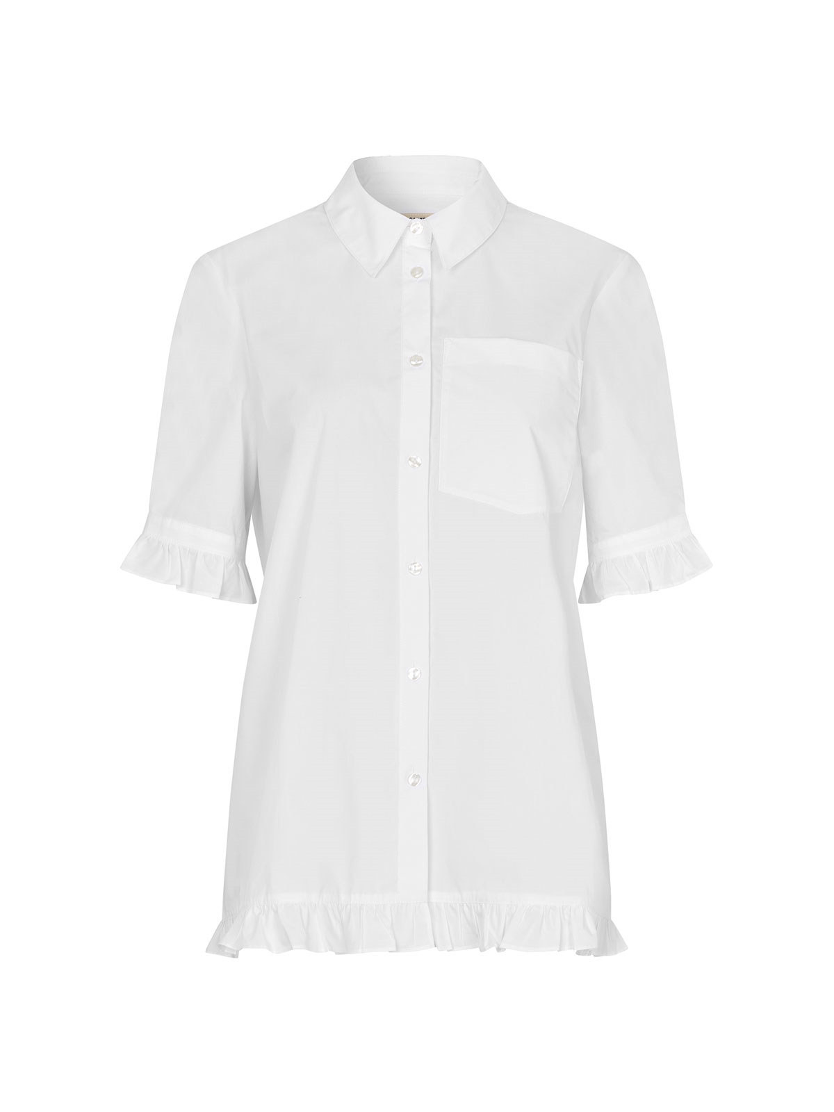 Skjorte fra Baum Und Pferdgarten. Skjorten har korte ærmer og lukkes med knapper. Den har en påsyet brystlomme og den har flæser ved ærmerne og nederst. Løs pasform.