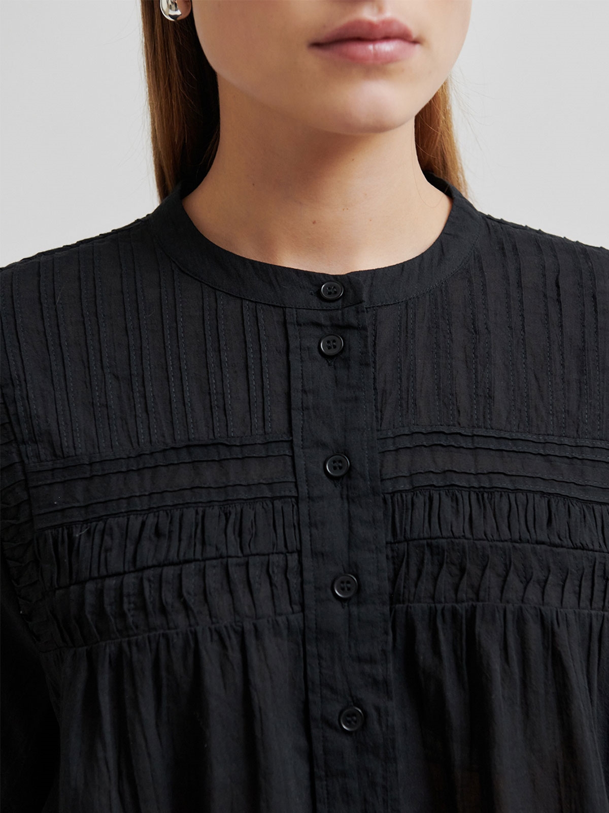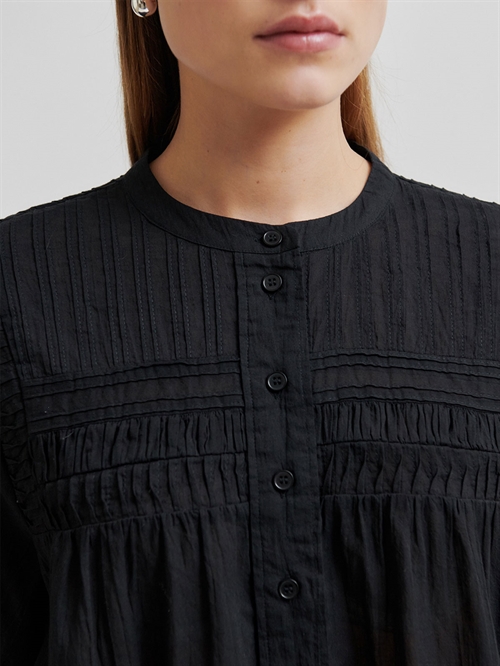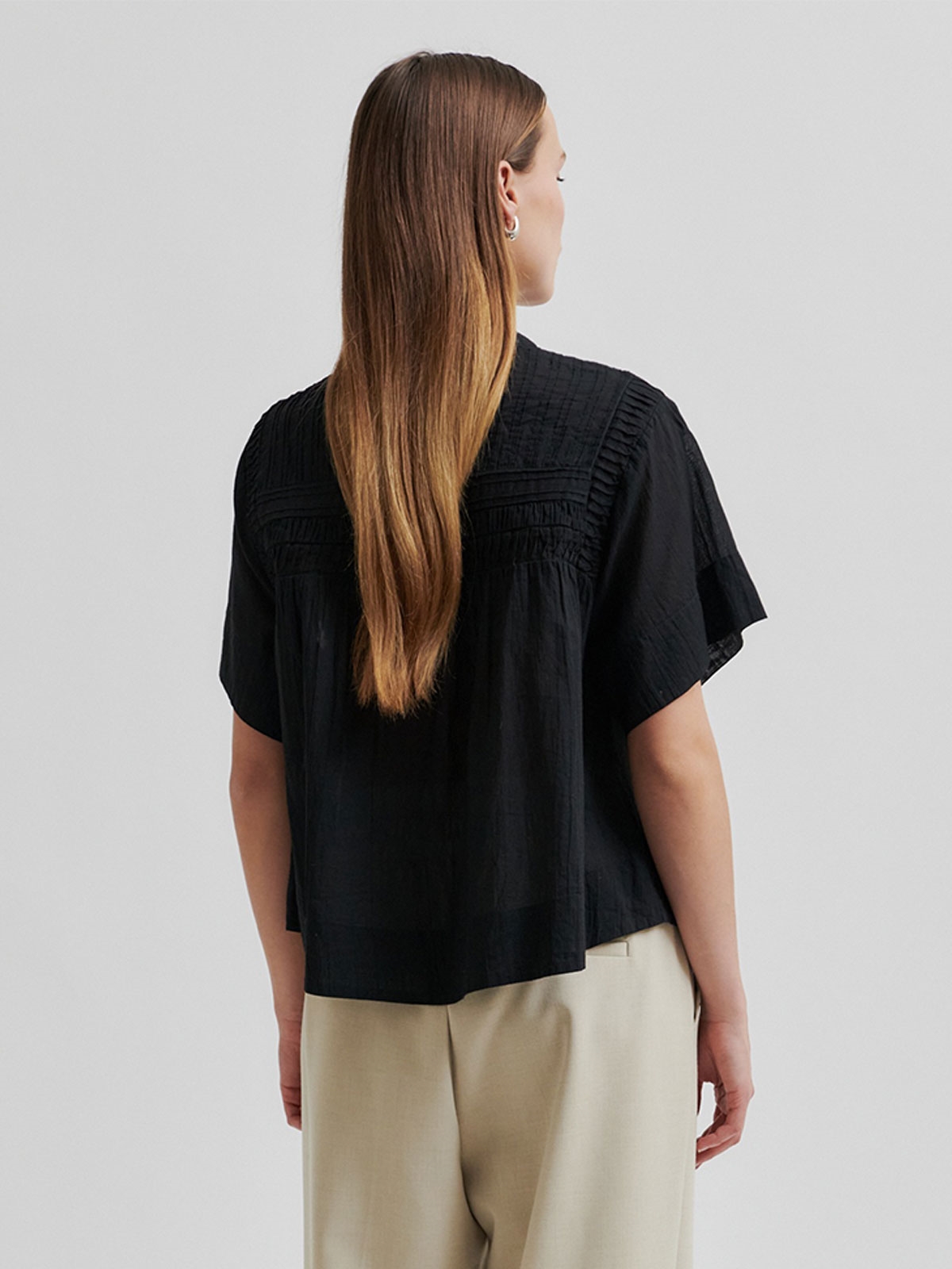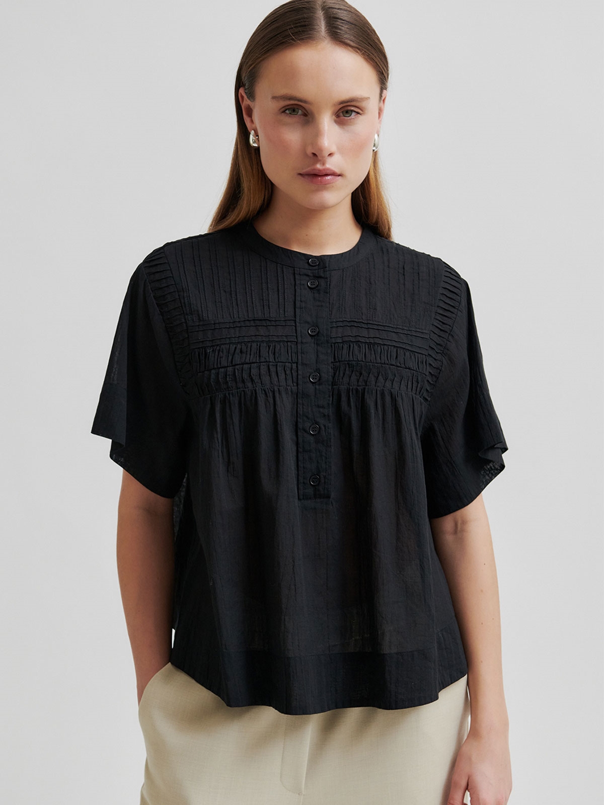 Bluse fra Second Female. Denne bluse har rund hals, korte ærmer og stolpelukning. Løs pasform.