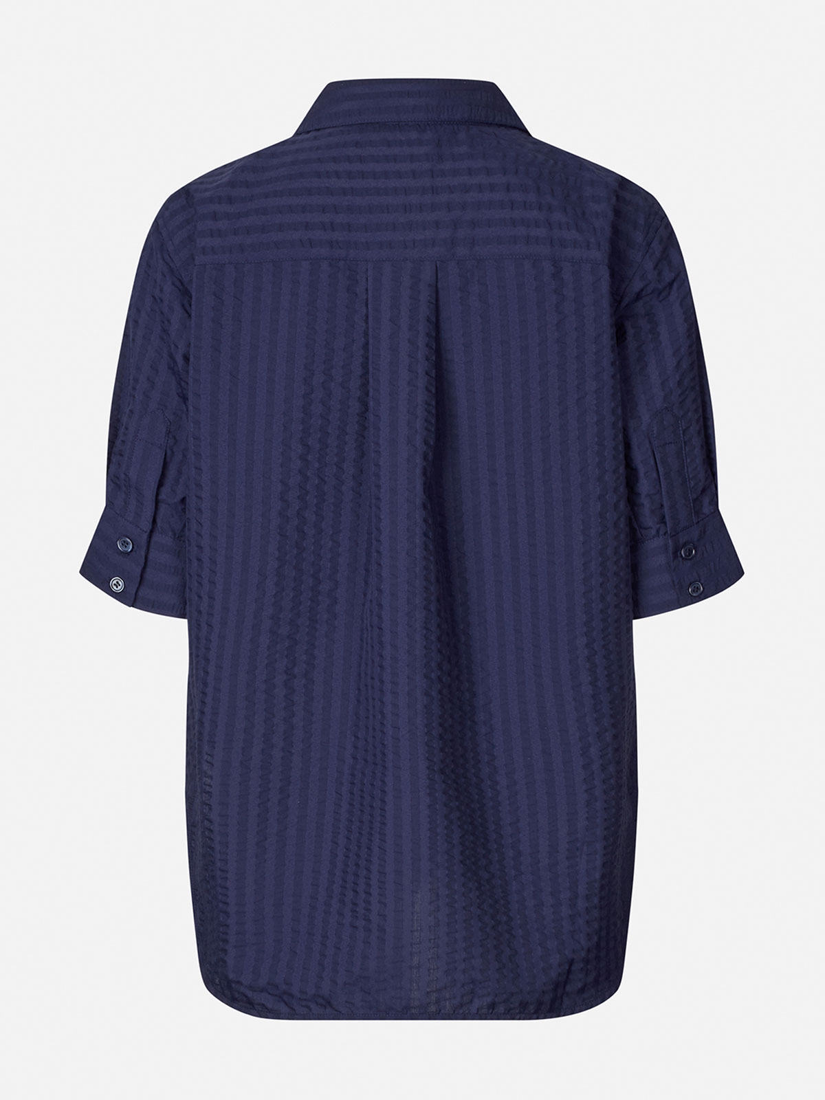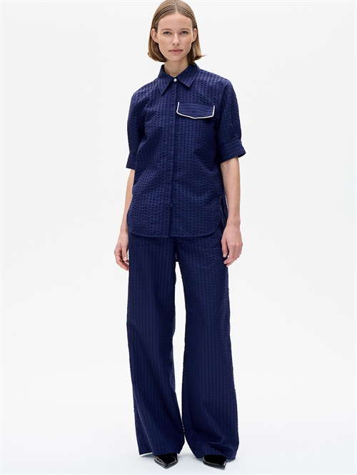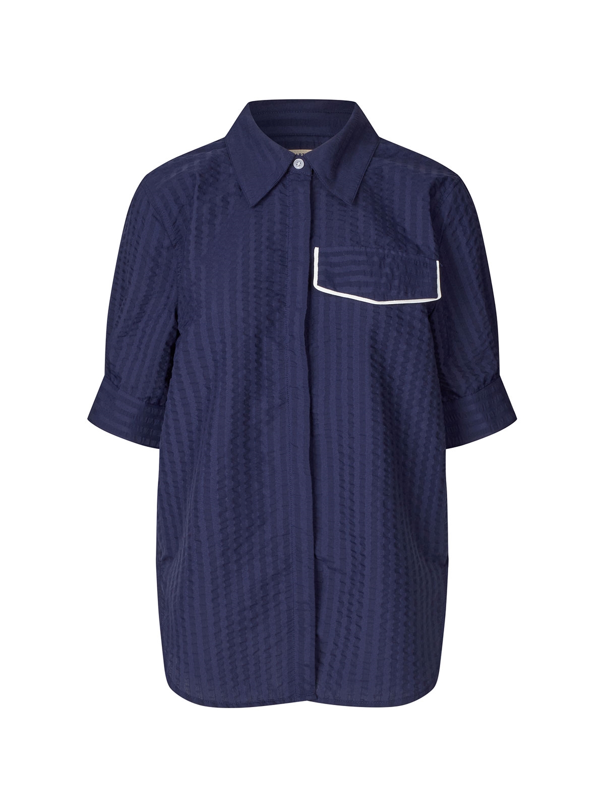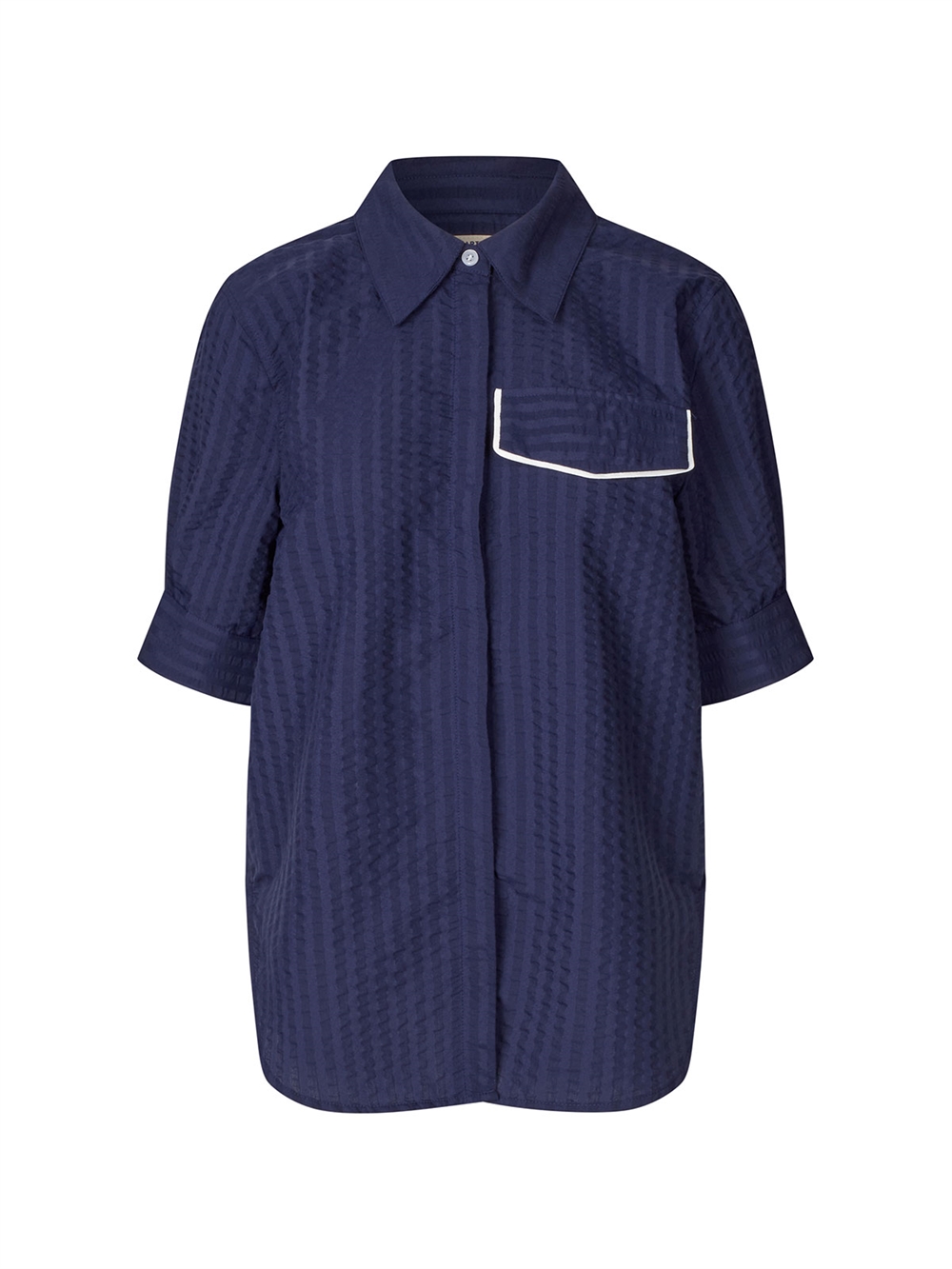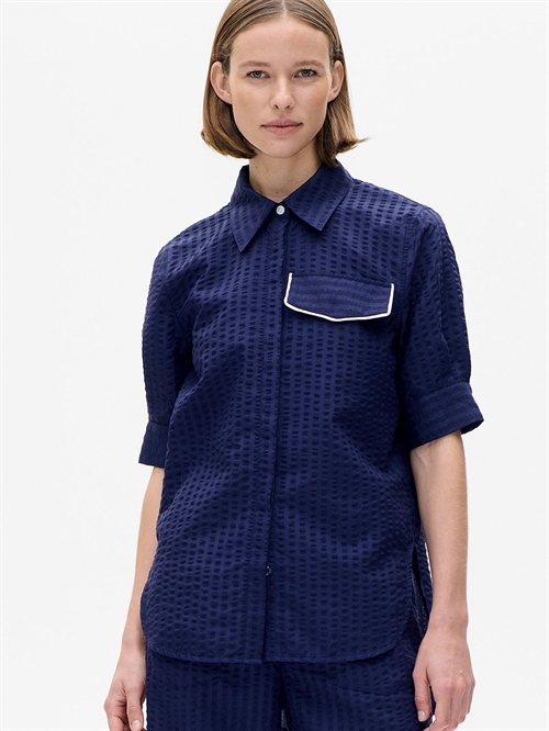 Skjorte fra Baum Und Pferdgarten. Skjorten har krave, korte ærmer og lukkes med knapper. Den har en snydelomme på brystet med hvid kant. Den er længere bagpå med buet kant. Almindelig pasform.