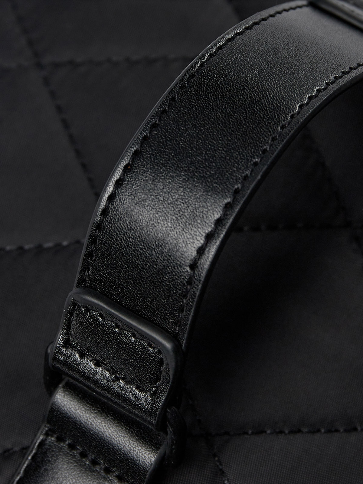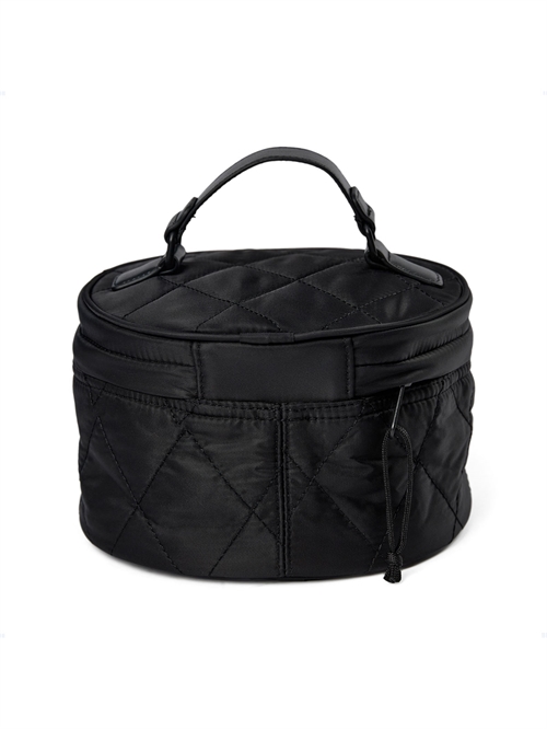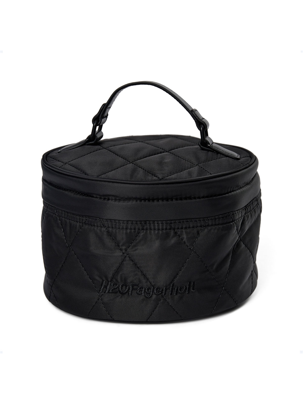 Quiltet toilet taske fra H2OFagerholt. Tasken har et stort rum samt tre små indvendig rum. Den lukkes med lynlås og bæres i en læder strop. Den har broderet logo foran. Tasken måler 13 cm høj x 19 cm i omkreds. 3L.