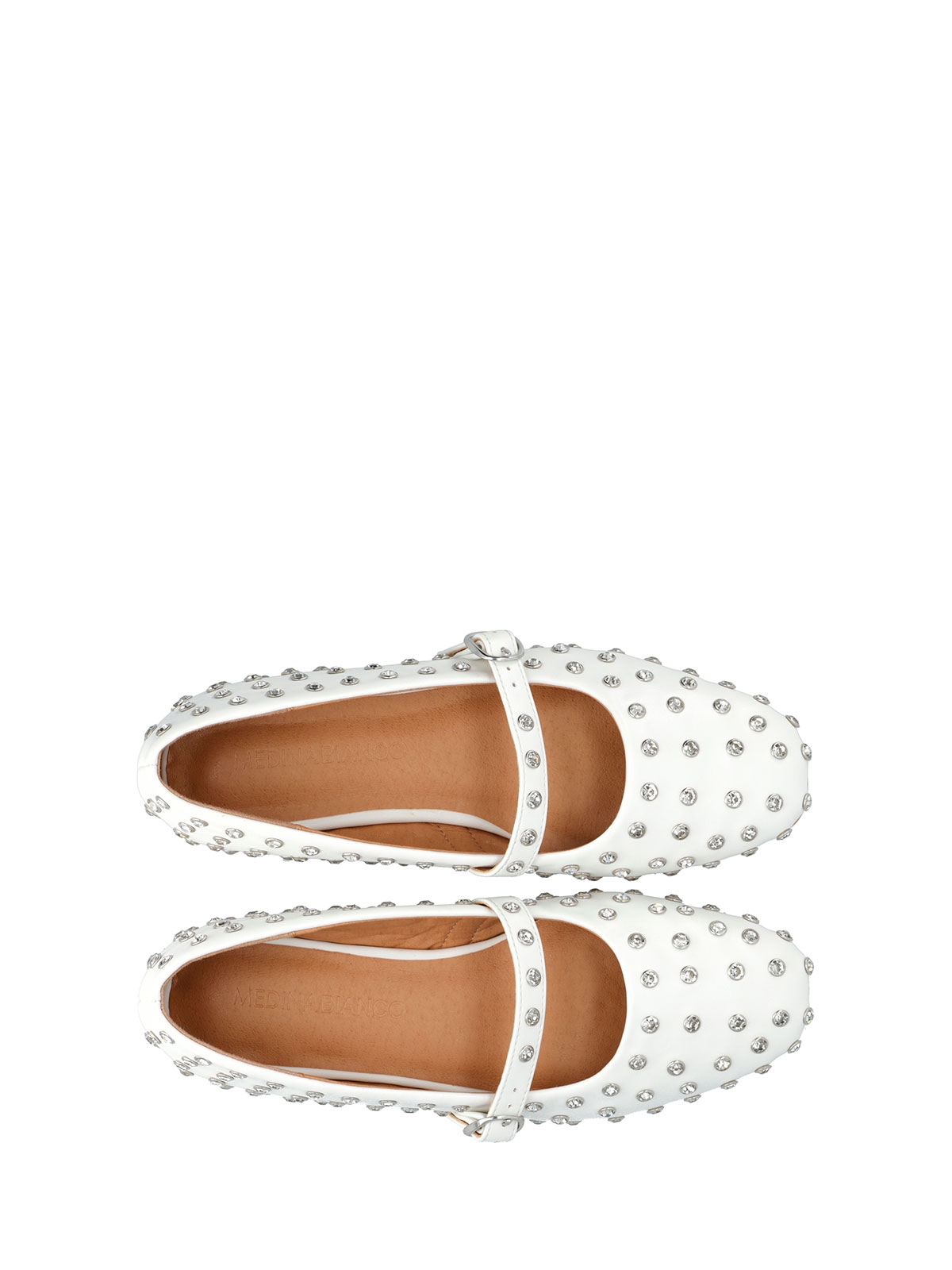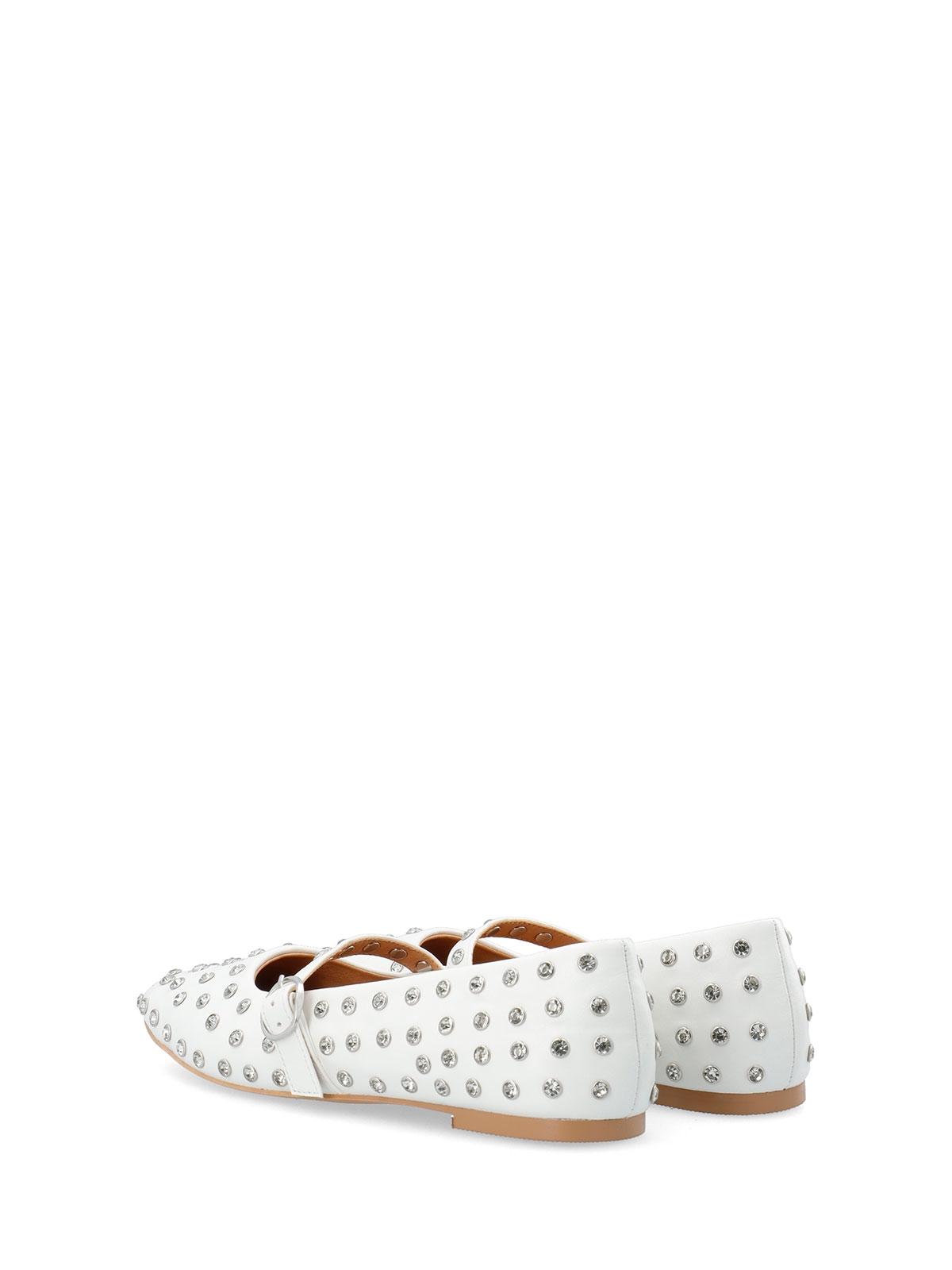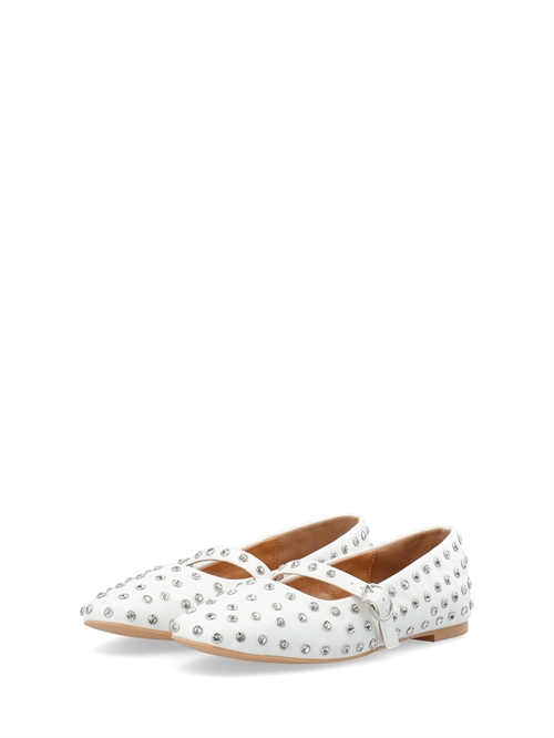 Ballerina fra Bianco. Skolen har rund snude og rem med spænde over fodryggen. Den er beklædt med similisten.