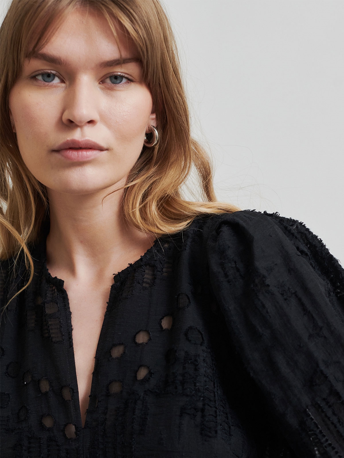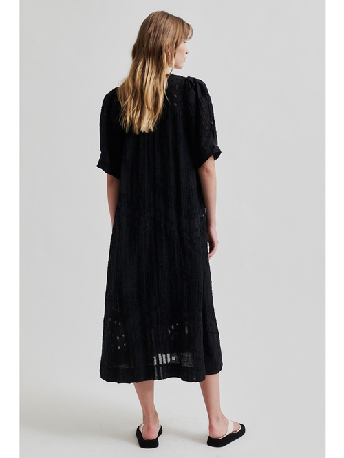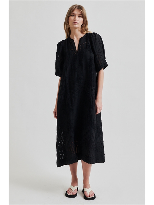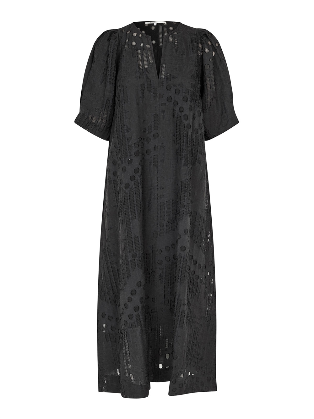 Kjole med grafisk mønster fra Second Female. Kjolen har v-hals og korte puf ærmer. Den er i semitransparent mønster og har en aftagelig underkjole. Løs pasform med A-facon.