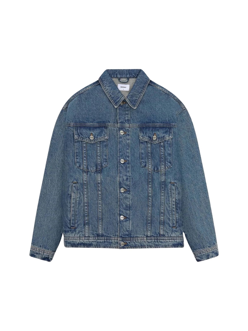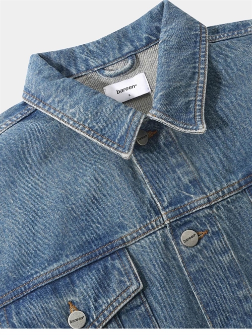 Denim jakke fra Bareen. Jakken har en klassisk krave, sænkede skuldre og brede to-søms ærmer. Den har to brystlommer med knapper, sidelommer, justerbare manchetter og den lukkes med knapper. Den har diskret logo patch på ryggen ryg.