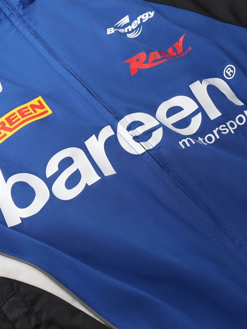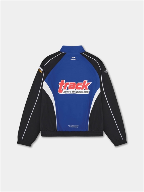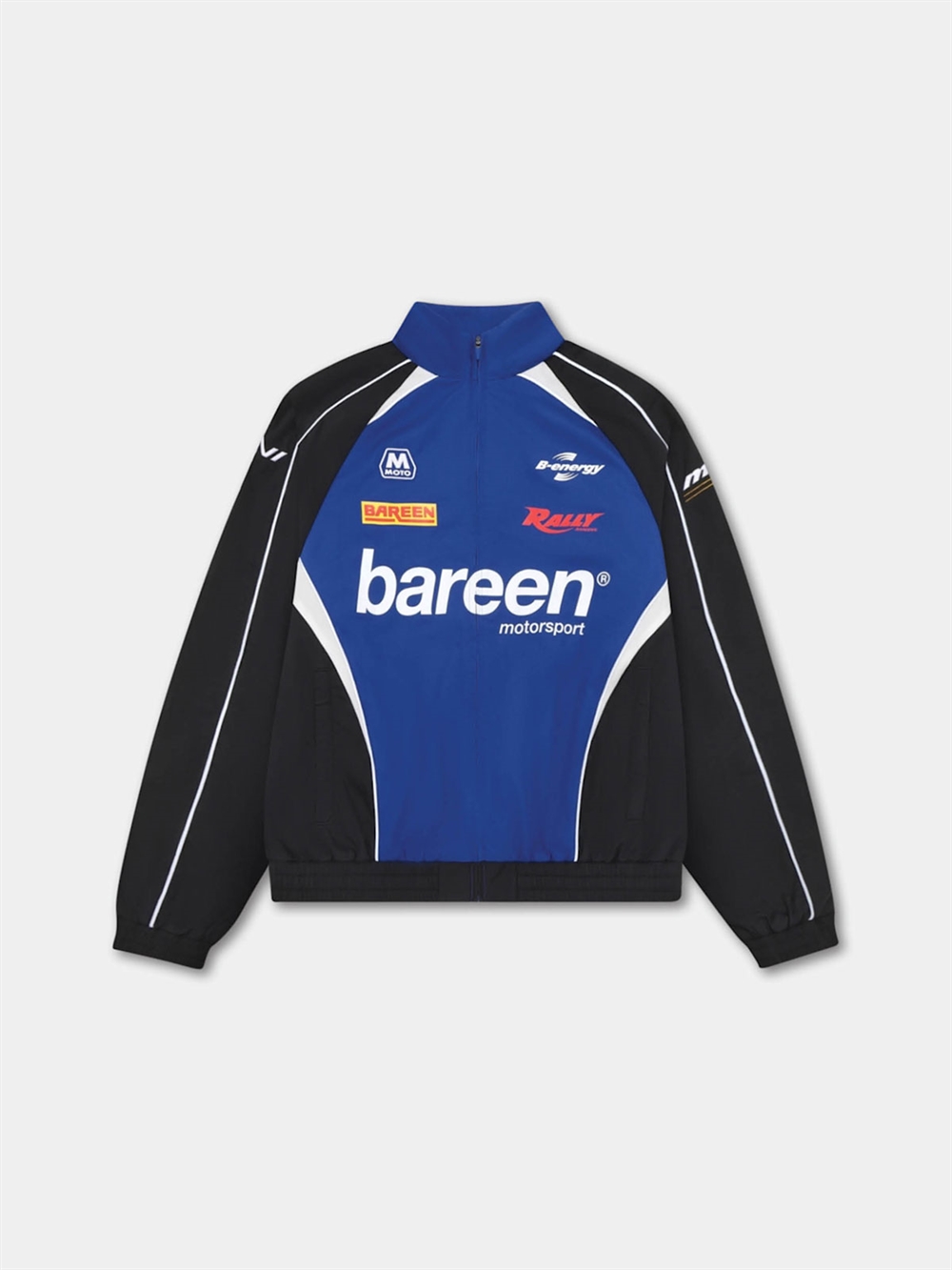 Track jakke fra Bareen. Denne jakke har høj hals, lange raglan ærmer og den lukkes med to-vejs lynlås. Den har logodetaljer på brystet og ryggen. Jakken har to lommer med lynlåslukning, elastikbånd ved talje og håndled samt hvide kantbånd.