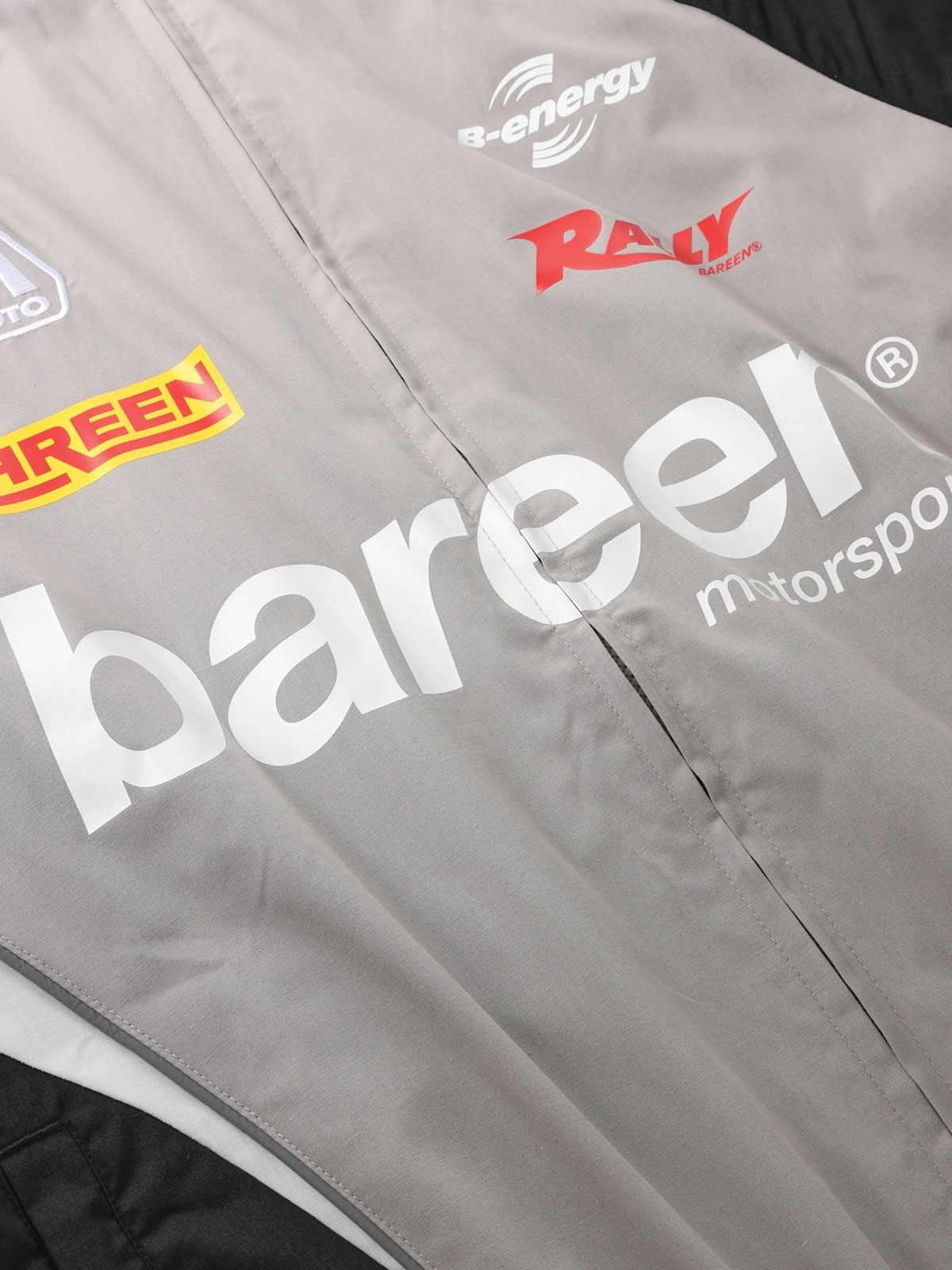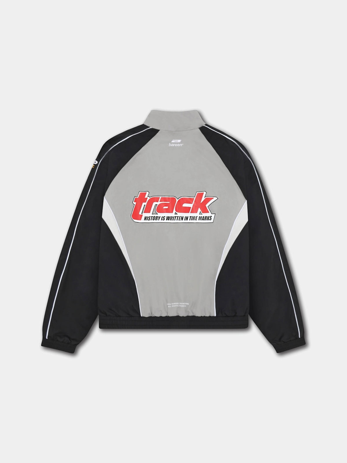 Track jakke fra Bareen. Denne jakke har høj hals, lange raglan ærmer og den lukkes med to-vejs lynlås. Den har logodetaljer på brystet og ryggen. Jakken har to lommer med lynlåslukning, elastikbånd ved talje og håndled samt hvide kantbånd.