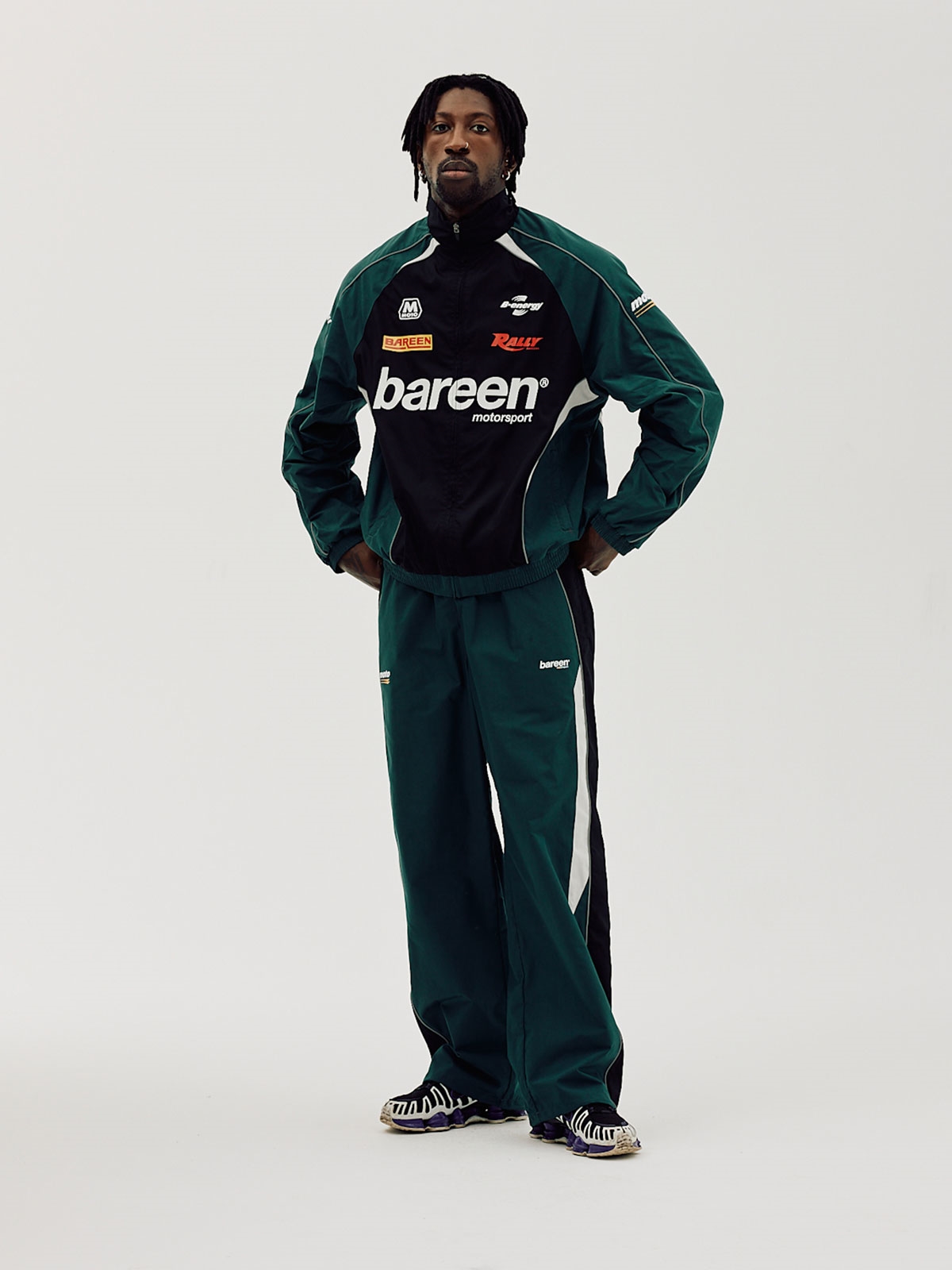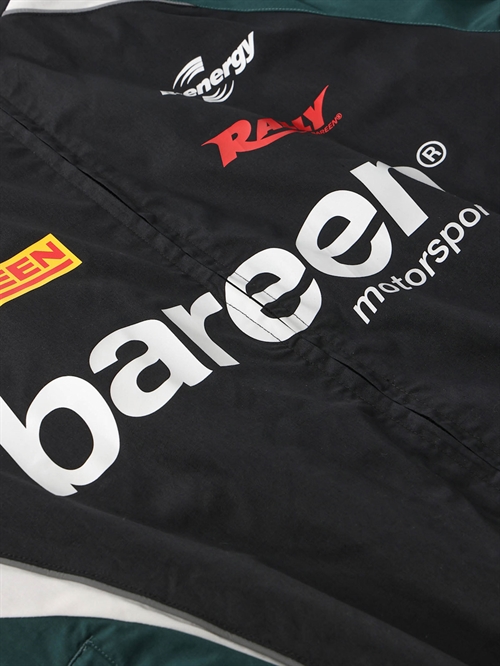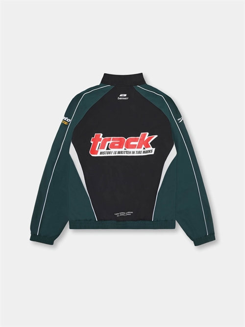 Track jakke fra Bareen. Denne jakke har høj hals, lange raglan ærmer og den lukkes med to-vejs lynlås. Den har logodetaljer på brystet og ryggen. Jakken har to lommer med lynlåslukning, elastikbånd ved talje og håndled samt hvide kantbånd.