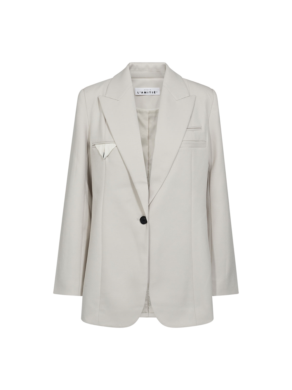 Blazer fra Haute L'Amitié. Blazeren har hakreverse, lange ærmer og lukkes med én knap.