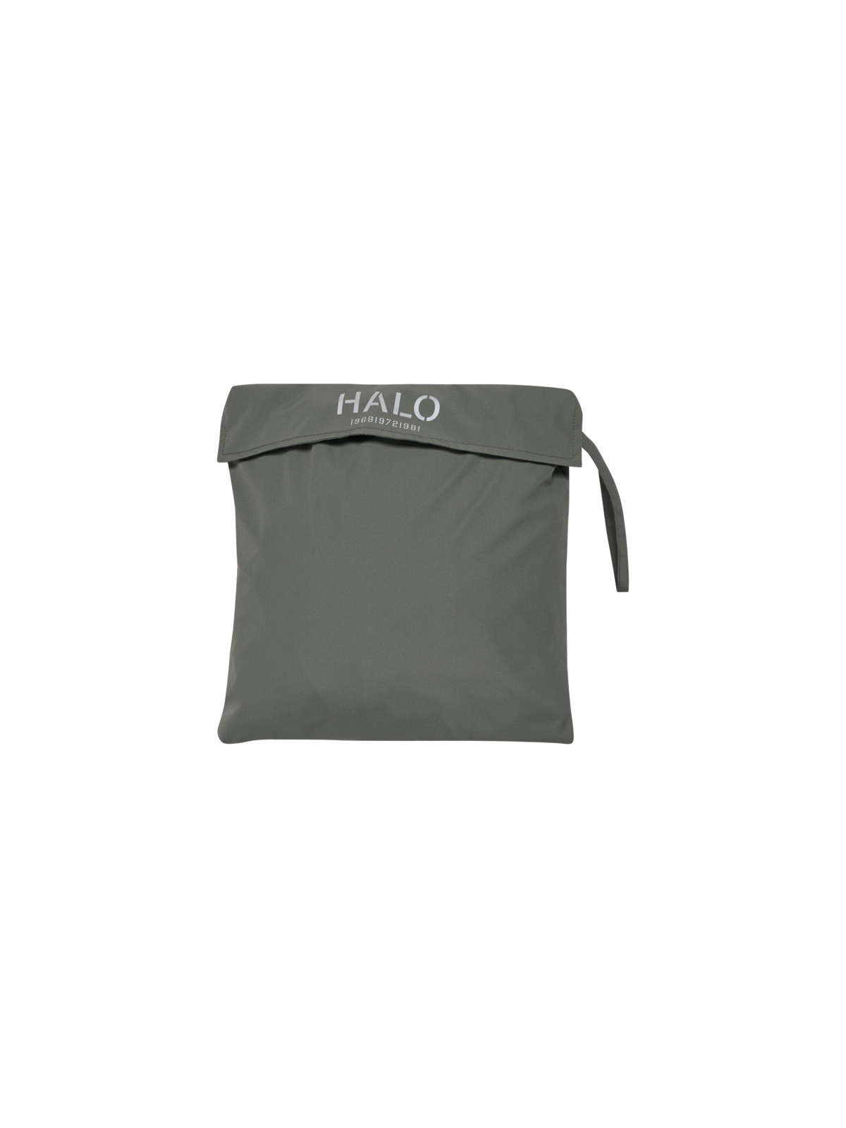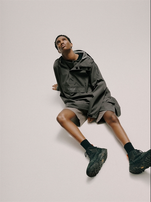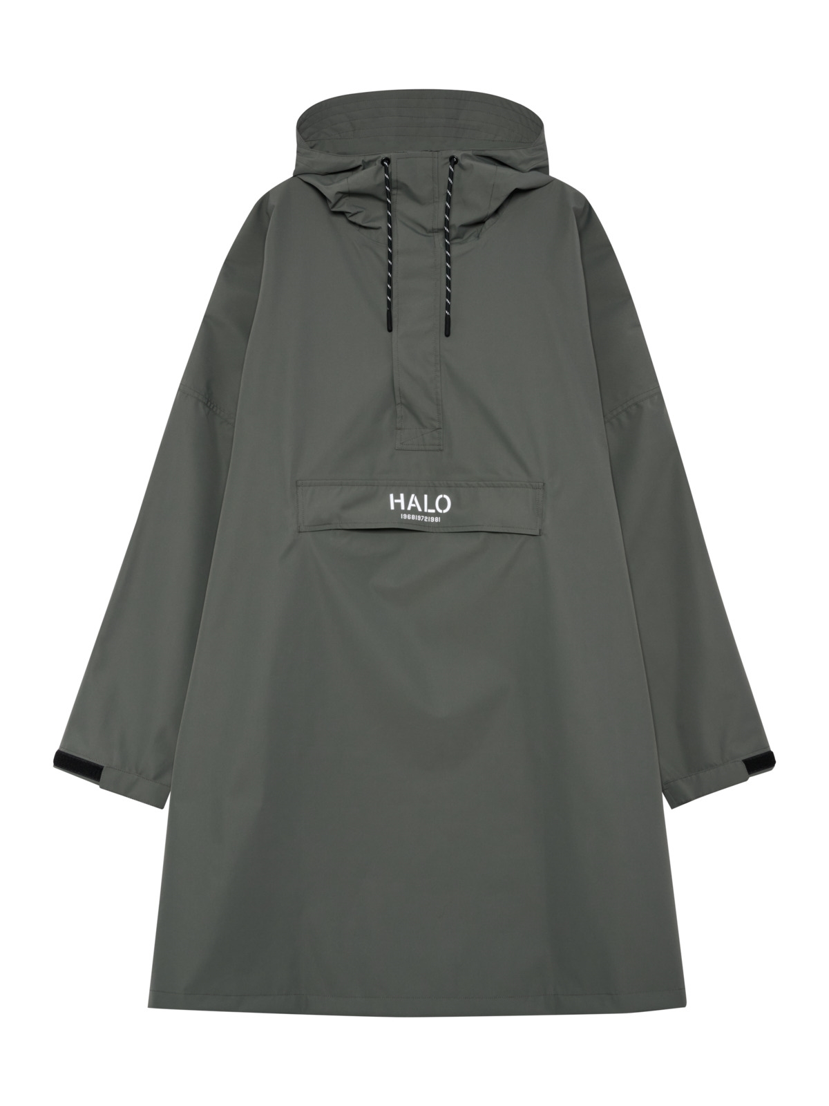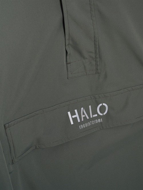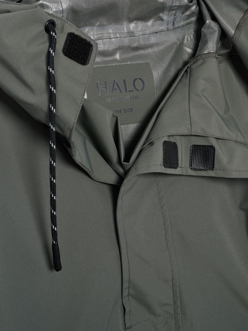 Regnslag fra HALO. Regnslaget er lavet med vandafvisende imprægnering (DWR). Den er slidstærk og har fuldt tapede sømme. Regnslaget har en åndbarhed på 5000 og et vandsøjletryk på 8000. Den har hætte med justerbar snøre samt en rummelig lomme foran med reflekterende logo. Lynlås til midt på brystet.