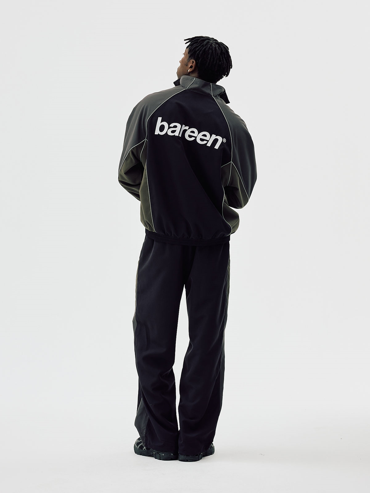 Track bukser fra Bareen. Disse bukser har elastik og snøre i taljen samt vide ben med ben åbning. Broderet logo på venstre lår og to lommer med lynlåslukning.