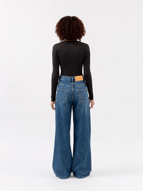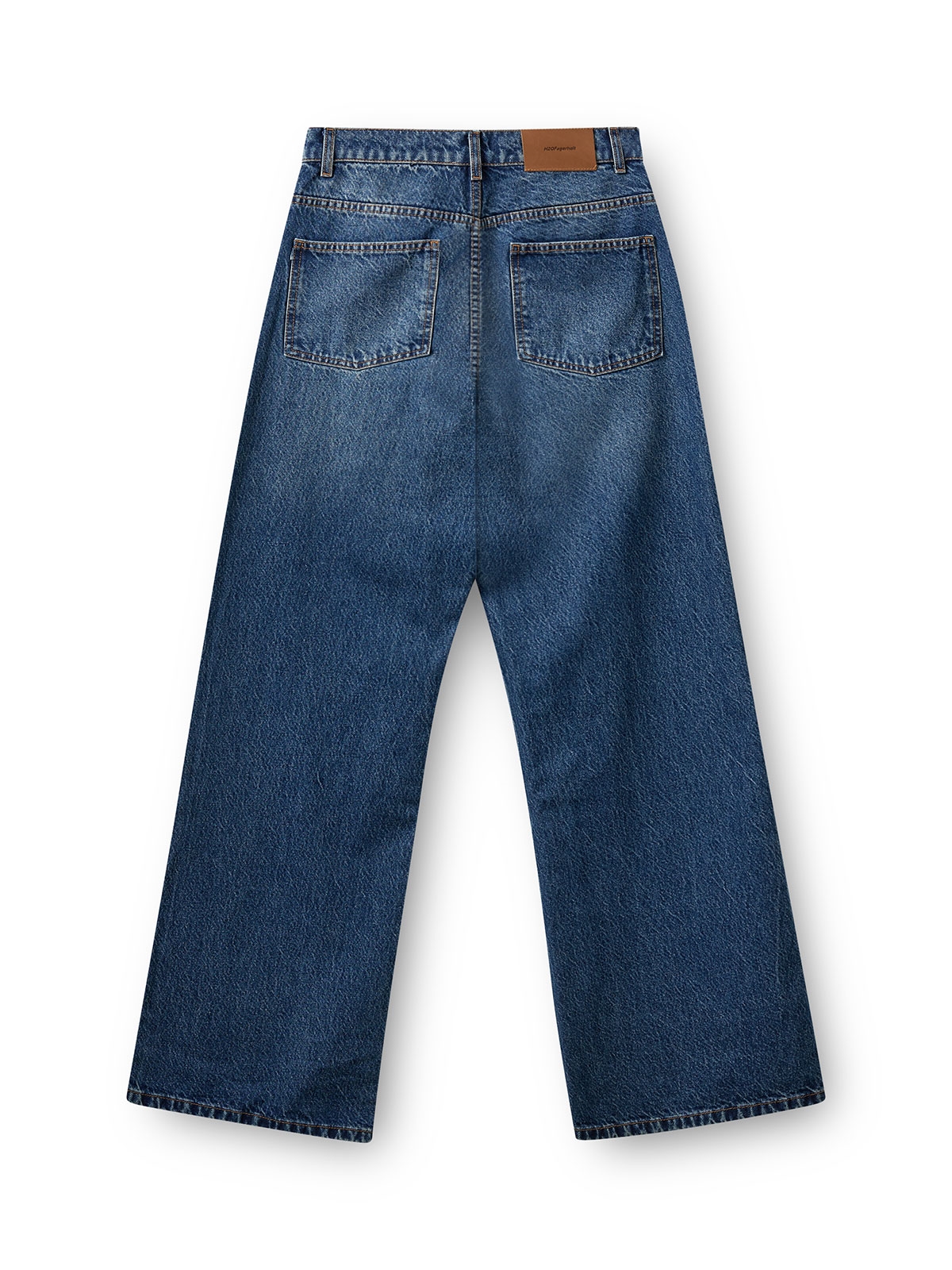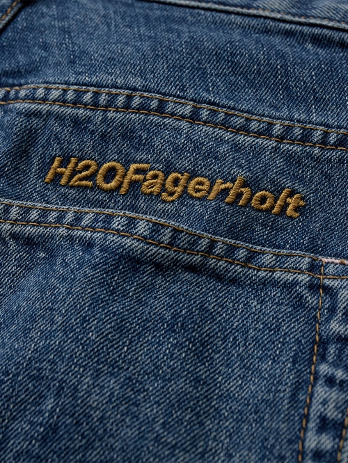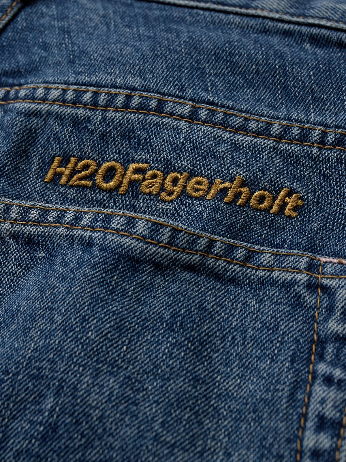 Jeans fra H2OFagerholt. Bukserne har lommer, høj talje samt brede ben. Broderet logo over venstre baglomme. Jeansene lukkes med lynlås og knap