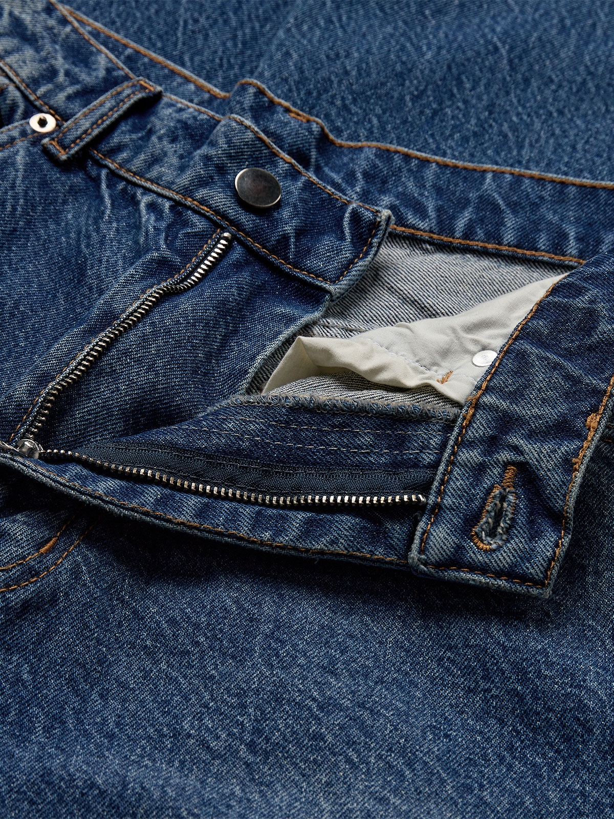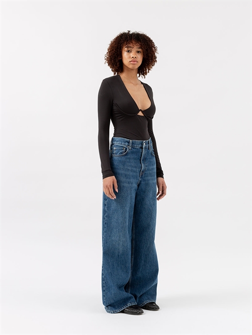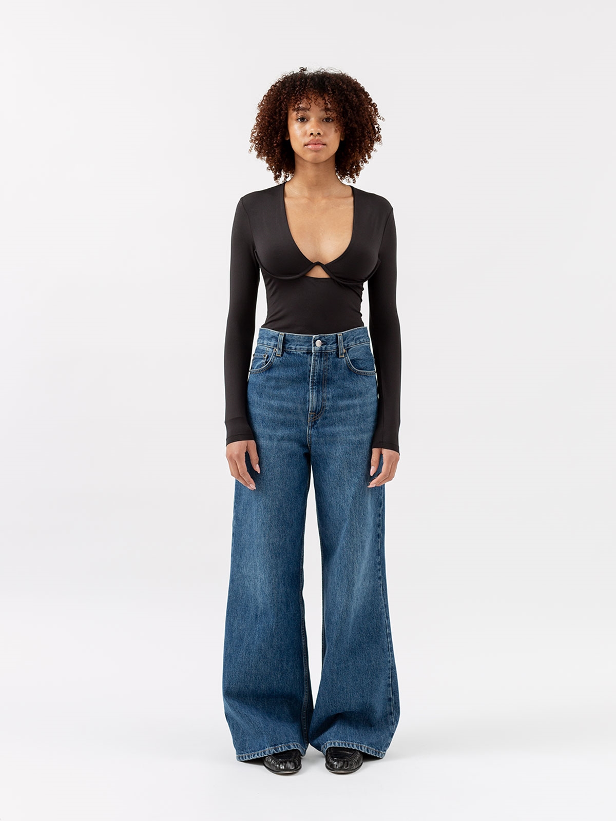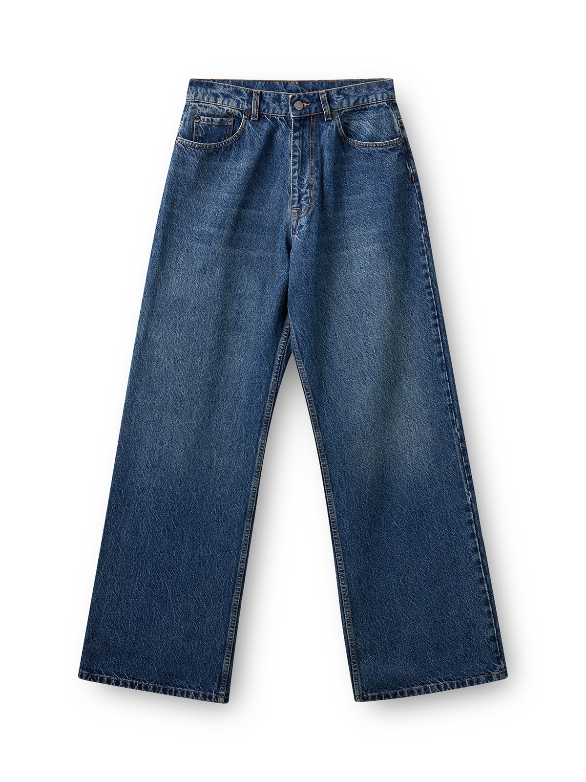 Jeans fra H2OFagerholt. Bukserne har lommer, høj talje samt brede ben. Broderet logo over venstre baglomme. Jeansene lukkes med lynlås og knap