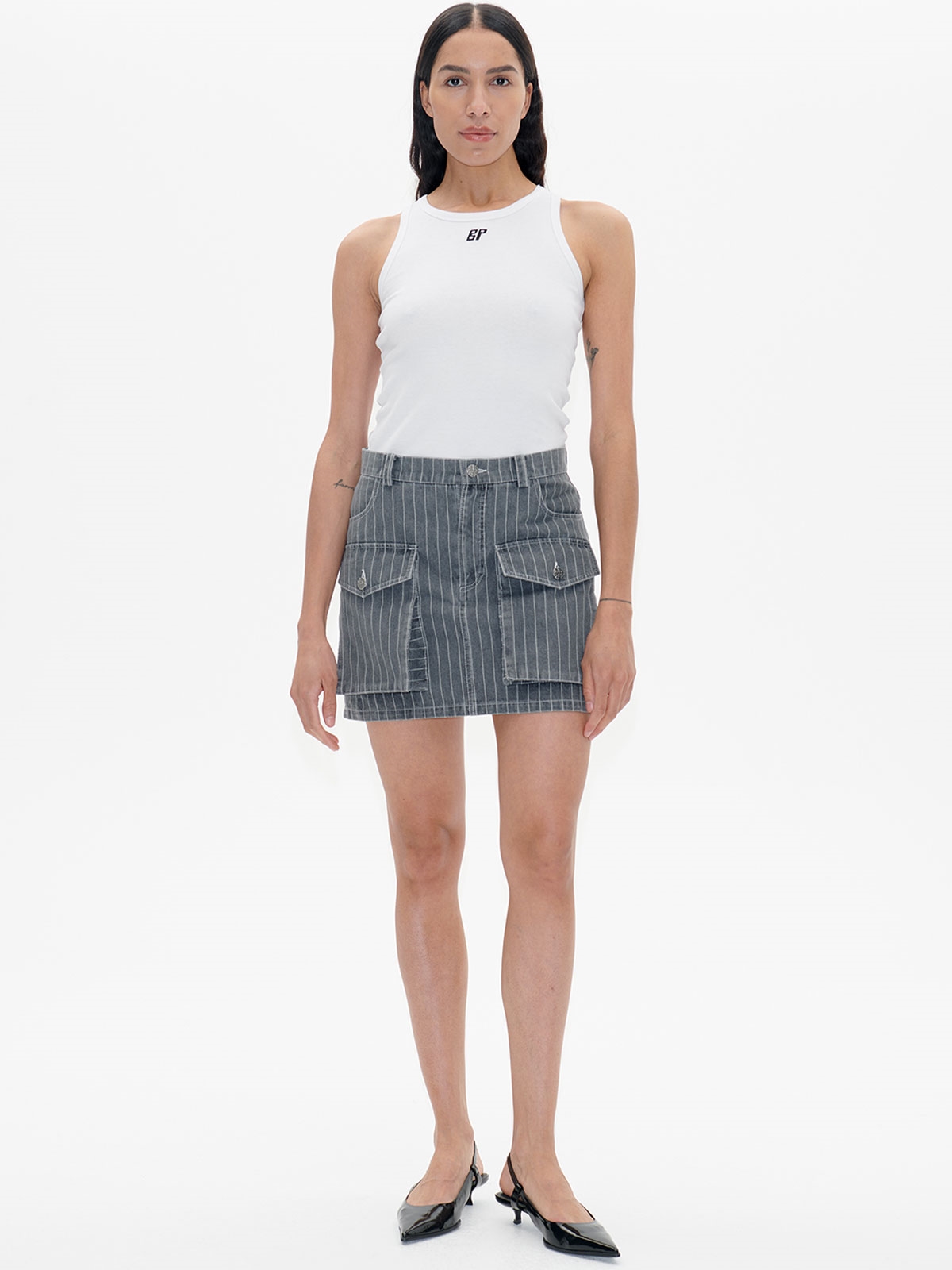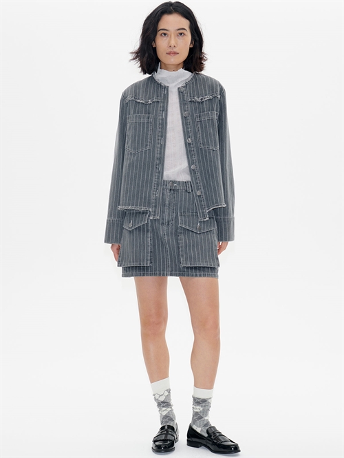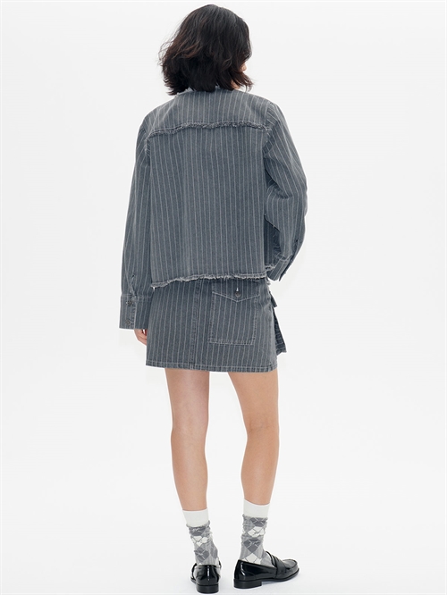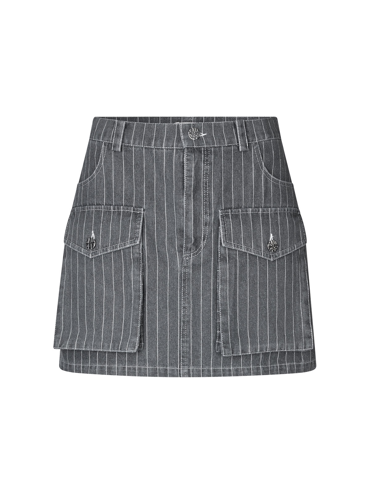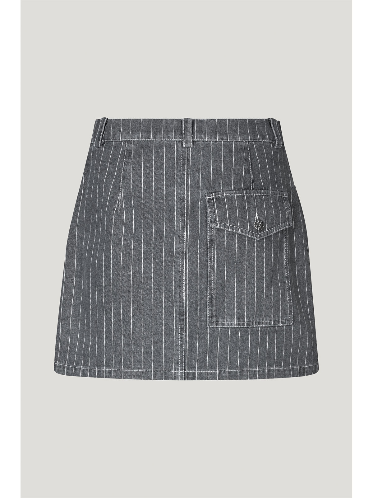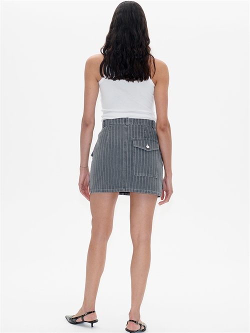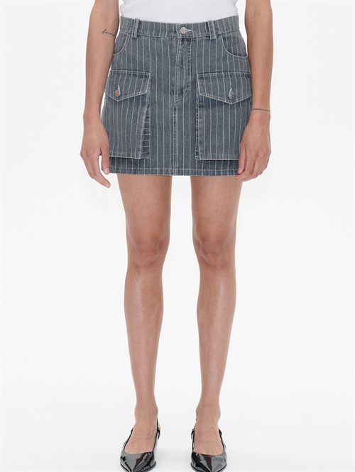 Denim nederdel fra Baum Und Pferdgarten. Nederdelen lukkes med lynlås og knap. Den har sidelommer, to store klap lommer foran samt en bagpå. Tætsiddende pasform.