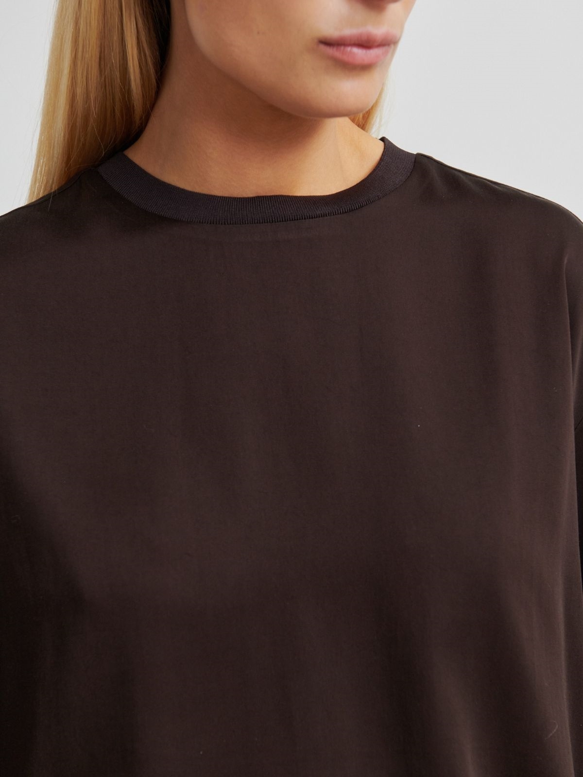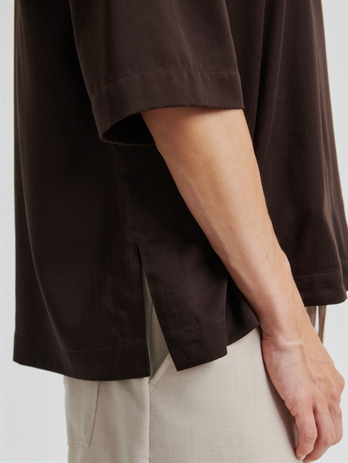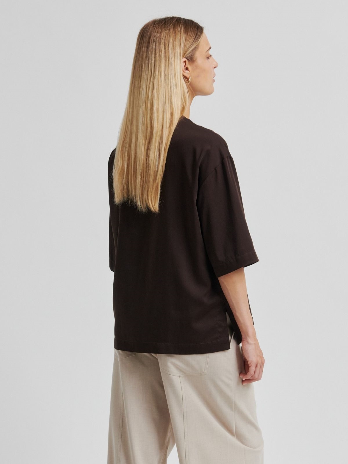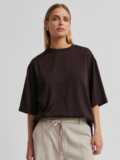Bluse fra Second Female. Denne silkebluse har rund hals i rib og og korte ærmer med lave skuldre. Den har slids i siden og løs pasform. Blusen er fremstillet i en silkeblød, draperet viskose-tencelblanding