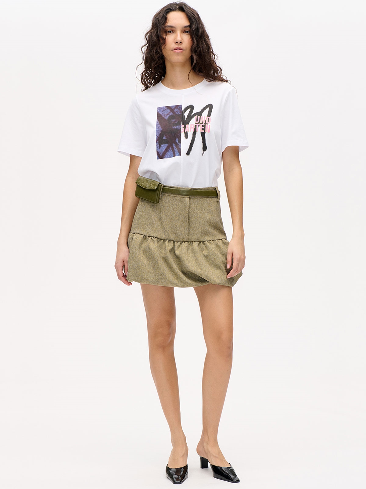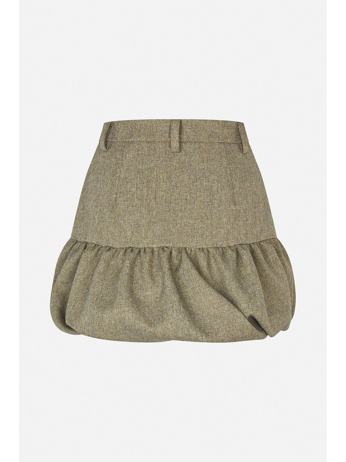 Mini nederdel med ballonkant fra Baum Und Pferdgarten. Nederdelen har fast talje med bæltestropper og den lukkes med lynlås og hægte.