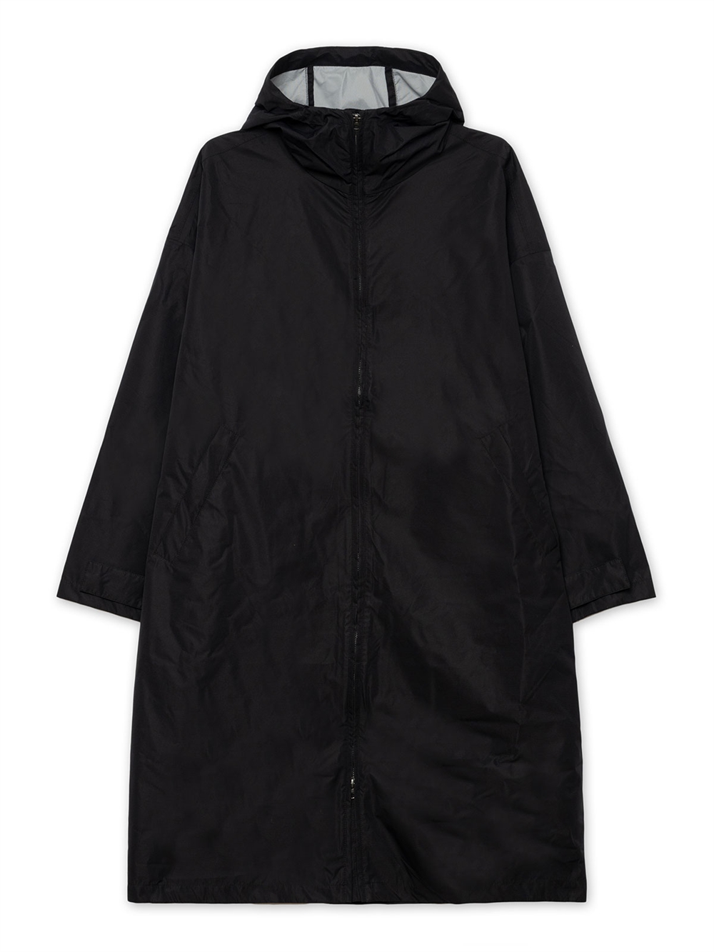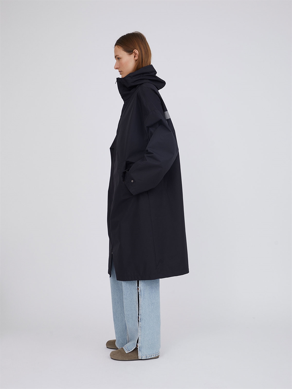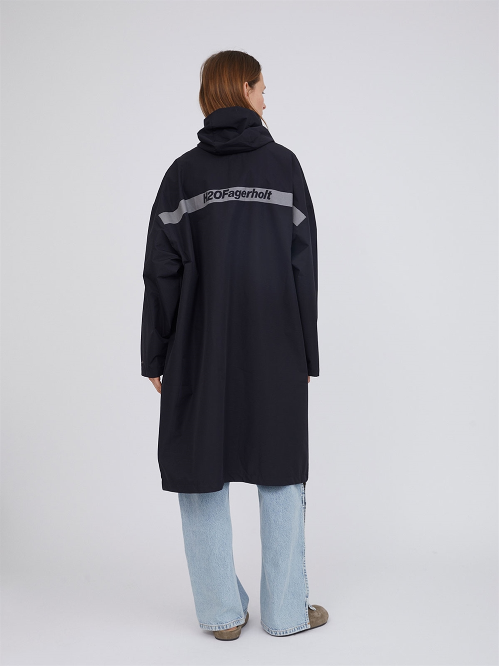 Regnjakke fra H2OFagerholt. Jakken har justérbar hætte med snøre, høj hals samt to lommer foran med knap. Den har reflekterende logo på ryggen. Jakken har flagermusærmer og den lukkes med 2-vejs lynlås. Jakken har drop shoulders og oversize pasform. Den har et vandsøjletryk på 10.000 mm