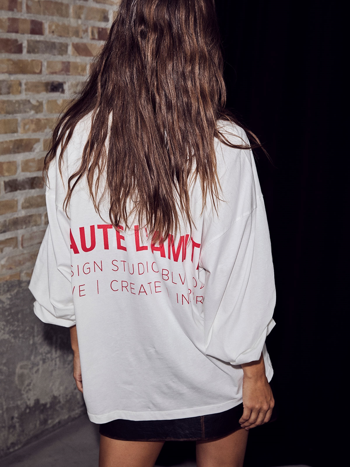 T-shirt fra Haute L'Amitié. T-shirten har rund hals, lange ærmer og logo på brystet og på ryggen.