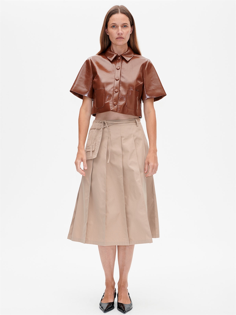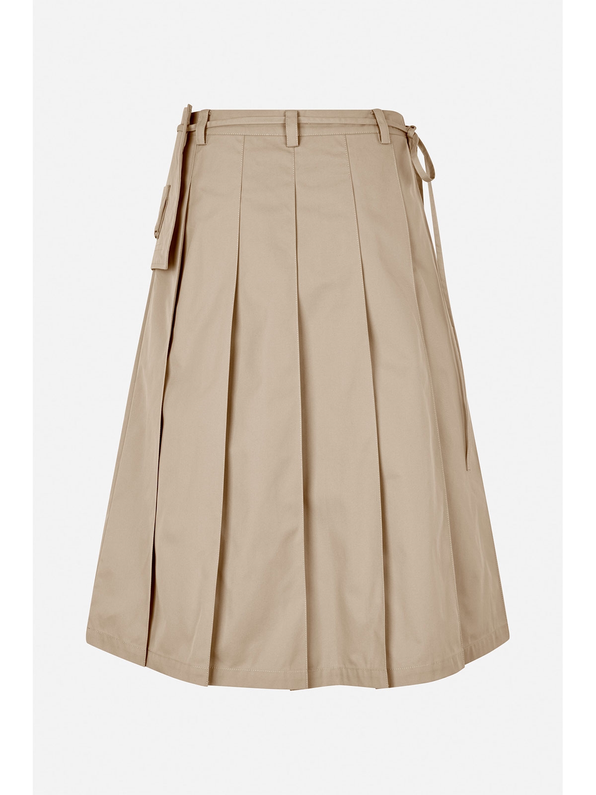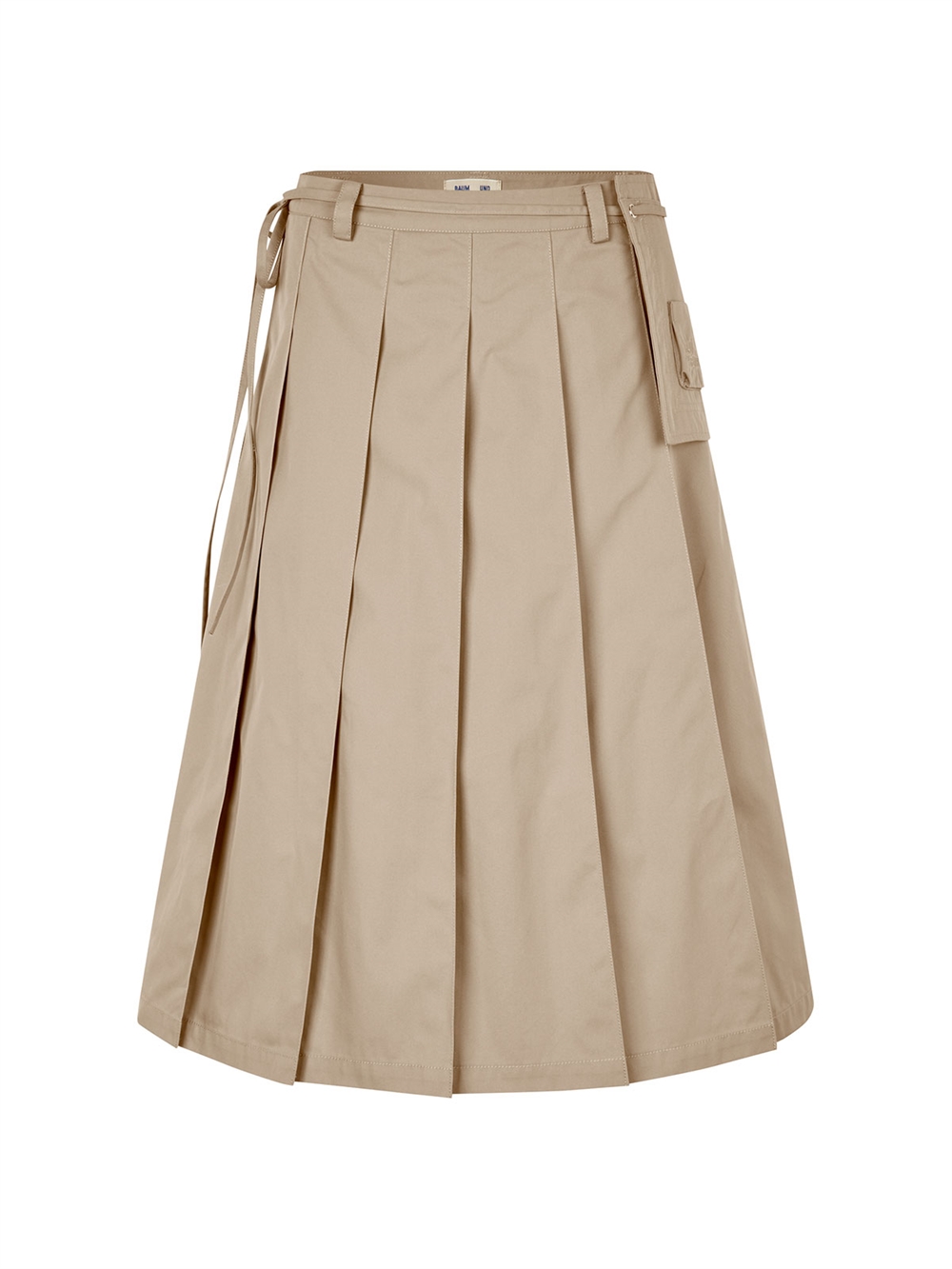 Midi nederdel fra Baum Und Pferdgarten. Nederdelen har fast talje med bæltestropper og lukkes med lynlås i siden. Den har en aftagelig taske som snøres i taljen,